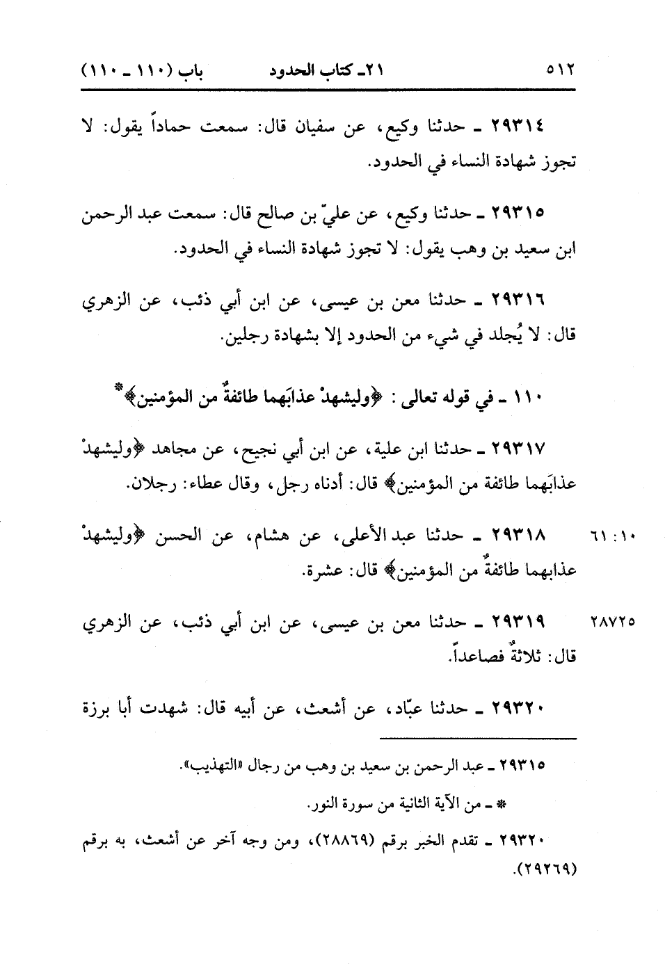 29315- حَدَّثَنَا وَكِيعٌ ، عَنْ عَلِىُّ بْنُ صَالِحٍ ، قَالَ : سَمِعْتُ عَبْد الرَّحْمن بن سَعِيد بْنِ وَهْبٍ ، يَقُولُ : لاَ تَجُوزُ شَهَادَةُ النِّسَاءِ فِي الْحُدُودِ.