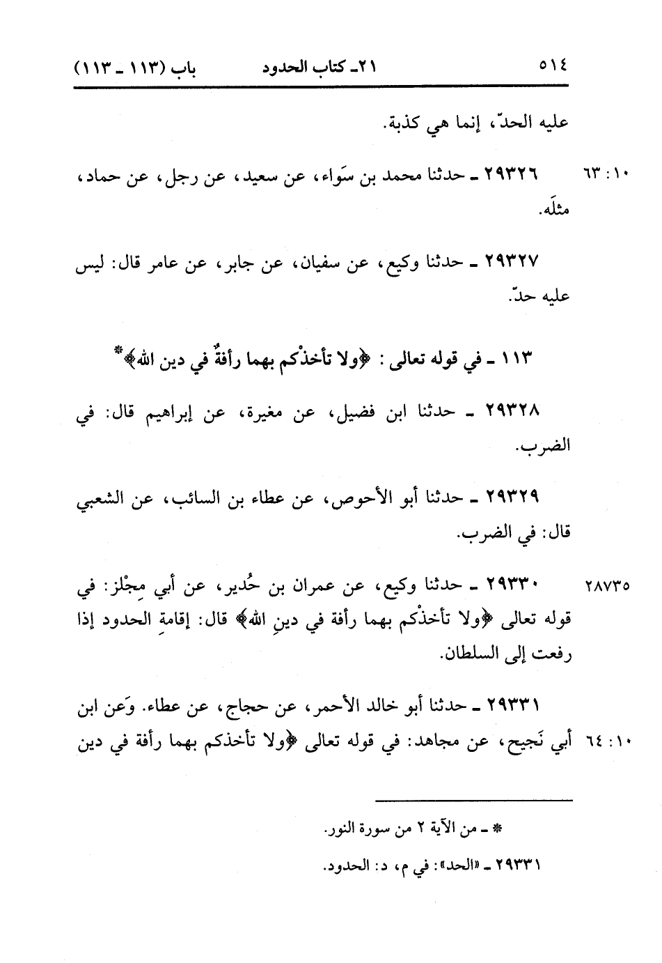 29330- حَدَّثَنَا وَكِيعٌ ، عَنْ عِمْرَانَ بْنِ حُدَيْرٍ ، عَنْ أَبِي مِجْلَزٍ ؛ فِي قَوْلِهِ تَعَالَى : {وَلاَ تَأْخُذْكُمْ بِهِمَا رَأْفَةٌ فِي دِينِ اللهِ} ، قَالَ : إِقَامَةُ الْحُدُودِ إِذَا رُفِعَتْ إِلَى السُّلْطَانِ. (10/63).