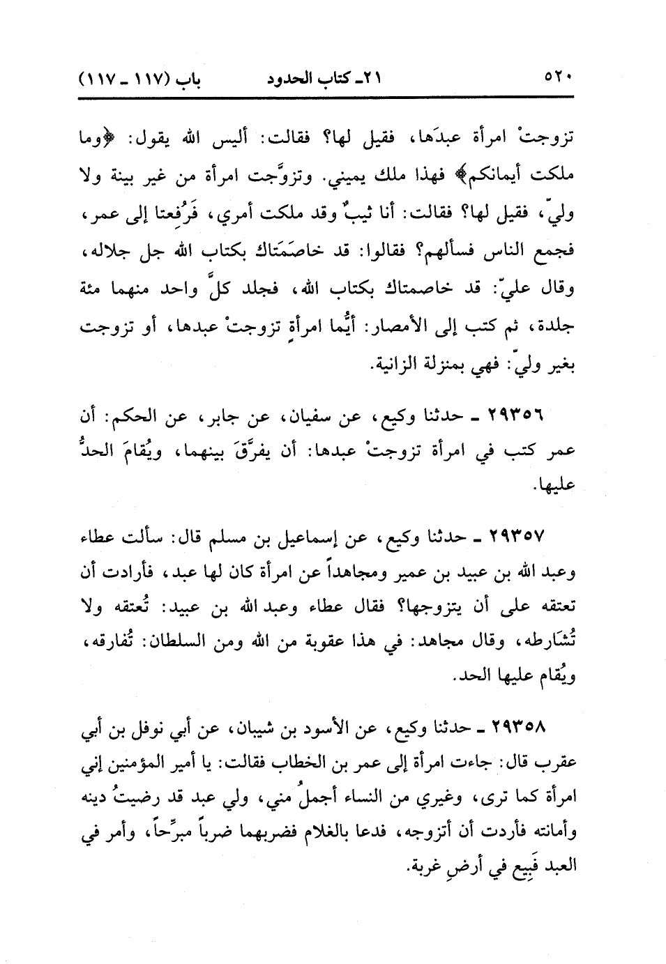 29355- حَدَّثَنَا مُحَمَّدُ بْنُ فُضَيْلٍ ، عَنْ حُصَيْنٍ ، عَنْ بَكْرٍ ، قَالَ : تَزَوَّجَتِ امْرَأَةٌ عَبْدَهَا ، فَقِيلَ لَهَا ؟ فَقَالَتْ : أَلَيْسَ اللَّهُ يَقُولُ : {وَمَا مَلَكَتْ أَيْمَانُكُمْ} فَهَذَا مْلِكُ يَمِينِي ، وَتَزَوَّجَتِ امْرَأَةٌ مِنْ غَيْرِ بَيِّنَةٍ ، وَلاَ وَلِيٍّ ، فَقِيلَ لَهَا ؟ فَقَالَتْ : أَنَا ثَيِّبٌ ، وَقَدْ مَلَكْتُ أَمْرِي ، فَرُفِعَتا إِلَى عُمَرَ ، فَجَمَعَ النَّاسَ فَسَأَلَهُمْ ؟ فَقَالُوا : قَدْ خَاصَمَتَاك بِكِتَابِ اللهِ جَلَّ جَلاَلُهُ ، وَقَالَ عَلِيٌّ : قَدْ خَاصَمَتَاك بِكِتَابِ اللهِ ، فَجَلَدَ كُلَّ وَاحِدٍ مِنْهُمَا مِئَةَ جَلْدَةٍ ، ثُمَّ كَتَبَ إِلَى الأَمْصَارِ : أَيُّمَا امْرَأَةٍ تَزَوَّجَتْ عَبْدَهَا ، أَوْ تَزَوَّجَتْ بِغَيْرِ وَلِيٍّ ، فَهِيَ بِمَنْزِلَةِ الزَّانِيَةِ. (10/69).