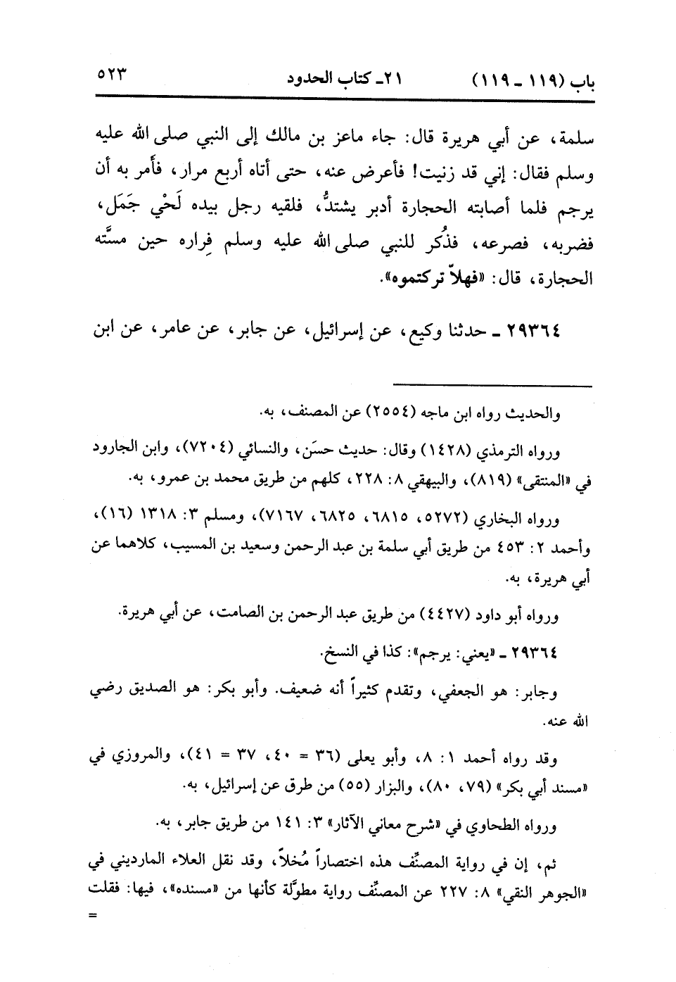 29364- حَدَّثَنَا وَكِيعٌ ، عَنْ إِسْرَائِيلَ ، عَنْ جَابِرٍ ، عَنْ عَامِرٍ ، عَنِ ابْنِ أَبْزَى ، عَنْ أَبِي بَكْرٍ ، قَالَ : أَتَى مَاعِزُ بْنُ مَالِكٍ النَّبِيَّ صَلَّى الله عَلَيْهِ وَسَلَّمَ ، فَأَقَرَّ عَندَهُ ثَلاَثَ مَرَّاتٍ ، فَقُلْتُ : إِنْ أَقْرَرْتَ عَندَهُ الرَّابِعَةَ ، فَأَمَرَ بِهِ فَحُبِسَ ، يَعْنِي يُرْجَمُ. (10/72).