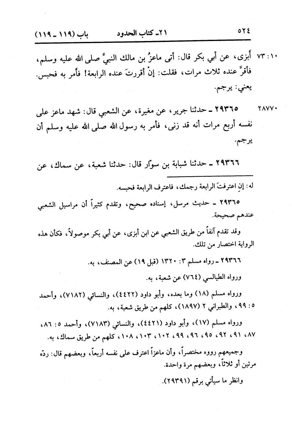 29366- حَدَّثَنَا شَبَابَةُ بْنُ سَوَّارٍ , قَالَ : حدَّثَنَا شُعْبَةُ ، عَنْ سِمَاكٍ ، عَنْ جَابِرِ بْنِ سَمُرَةَ ، قَالَ : رَأَيْتُ رَسُولَ اللهِ صَلَّى الله عَلَيْهِ وَسَلَّمَ حِينَ أُتِيَ بِمَاعِزِ بْنِ مَالِكٍ ، أُتِيَ بِرَجُلٍ أَشْعَرَ ذِي عَضَلاَتٍ ، فِي إِزَارِهِ ، فَرَدَّهُ مَرَّتَيْنِ ، ثُمَّ أَمَرَ بِرَجْمِهِ. (10/73).