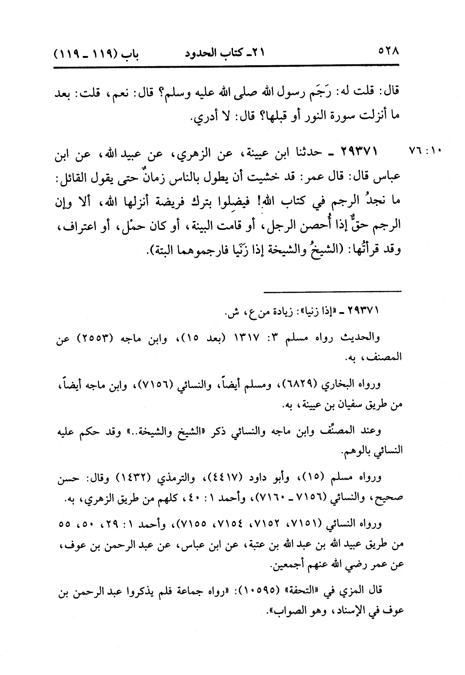 29371- حَدَّثَنَا ابْنُ عُيَيْنَةَ ، عَنِ الزُّهْرِيِّ ، عَنْ عُبَيْدِ اللهِ ، عَنِ ابْنِ عَبَّاسٍ ، قَالَ : قَالَ عُمَرُ : قَدْ خَشِيت أَنْ يَطُولَ بِالنَّاسِ زَمَانٌ حَتَّى يَقُولَ الْقَائِلُ : مَا نَجِدُ الرَّجْمَ فِي كِتَابِ اللهِ ، فَيَضِلُّوا بِتَرْكِ فَرِيضَةٍ أَنْزَلَهَا اللَّهُ ، أَلاَ وَإِنَّ الرَّجْمَ حَقٌّ ، إِذَا أُحْصِنَ الرَّجُل ، أَوْ قَامَتِ الْبَيِّنَةُ ، أَوْ كَانَ حَمْلٌ ، أَوِ اعْتِرَافٌ ، وَقَدْ قَرَأْتُهَا : {الشَّيْخُ وَالشَّيْخَةُ إِذَا زَنَيَا فَارْجُمُوهُمَا الْبَتَّةَ}.