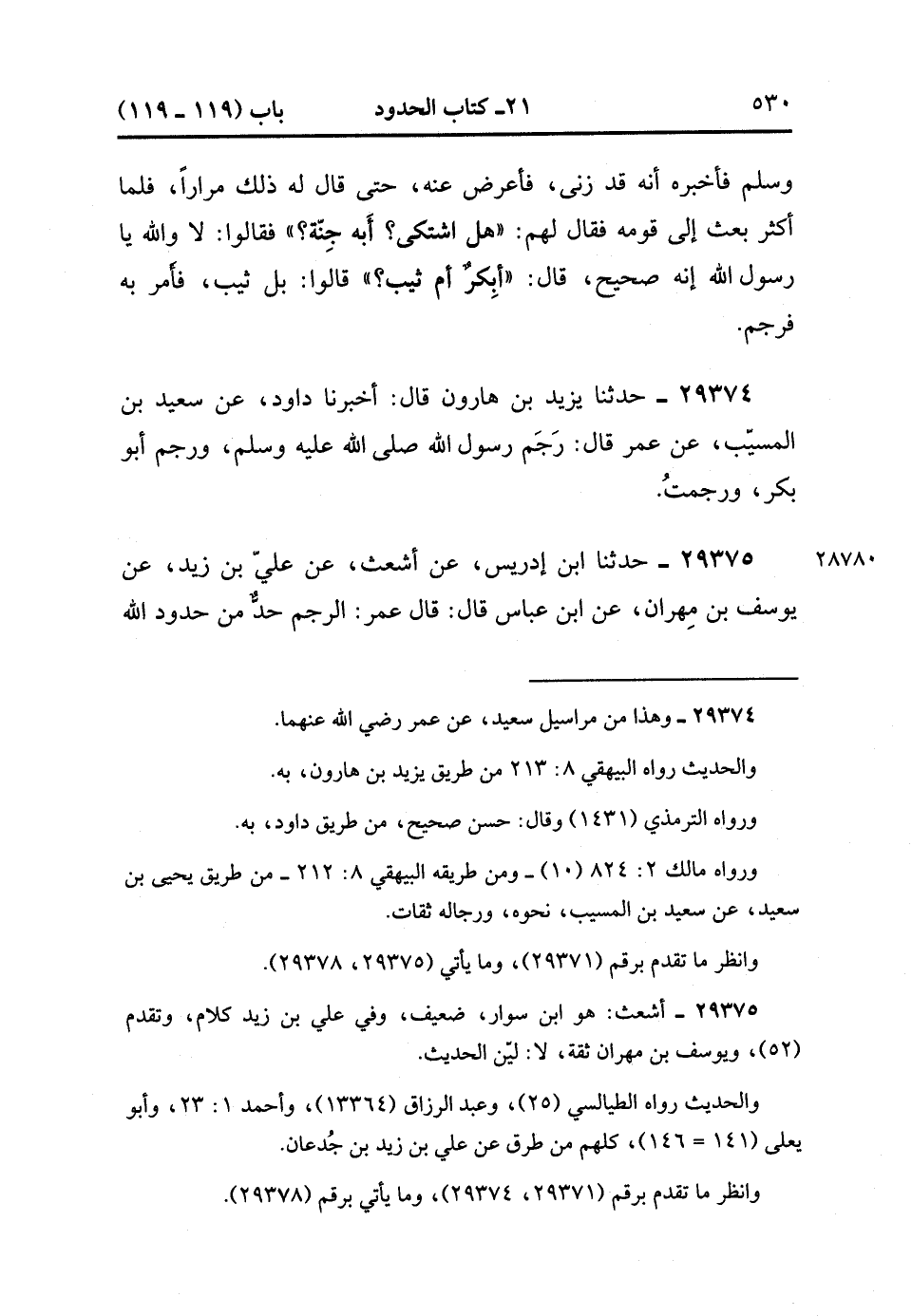 29375- حَدَّثَنَا ابْنُ إِدْرِيسَ ، عَنْ أَشْعَثَ ، عَنْ عَلِيِّ بْنِ زَيْدٍ ، عَنْ يُوسُفَ بْنِ مِهْرَانَ ، عَنِ ابْنِ عَبَّاسٍ ، قَالَ : قَالَ عُمَرُ : الرَّجْمُ حَدٌّ مِنْ حُدُودِ اللهِ ، فَلاَ تُخْدَعُوا عَنْهُ ، وَآيةُ ذَلِكَ ؛ أَنَّ رَسُولَ اللهِ صَلَّى الله عَلَيْهِ وَسَلَّمَ رَجَمَ ، وَرَجَمَ أَبُو بَكْرٍ ، وَرَجَمْتُ أَنَا. (10/77).