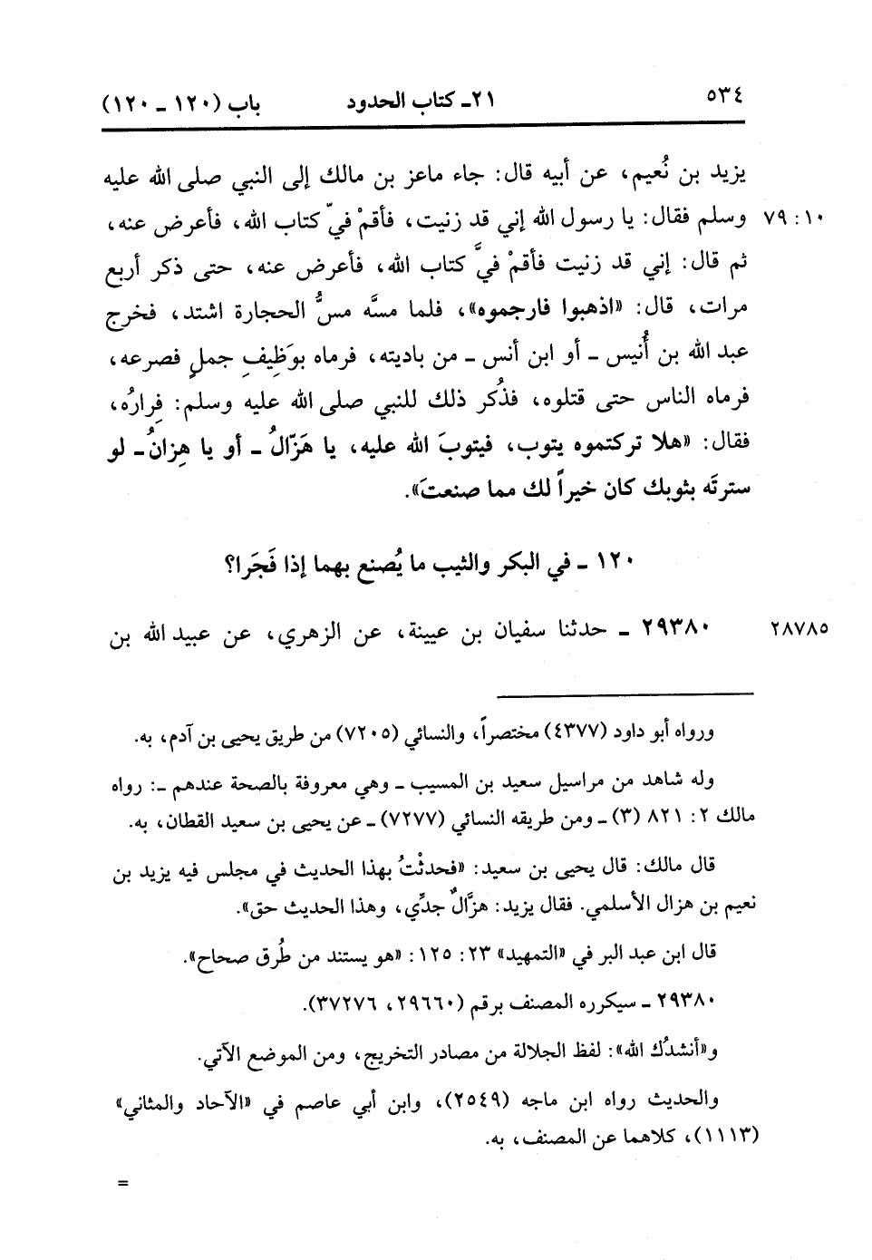 29379- حَدَّثَنَا يَحْيَى بْنُ آدَمَ ، عَنْ سُفْيَانَ ، عَنْ زَيْدِ بْنِ أَسْلَمَ ، عَنْ يَزِيدَ بْنِ نُعَيْمٍ ، عَنْ أَبِيهِ ،قَالَ : جَاءَ مَاعِزُ بْنُ مَالِكٍ إِلَى النَّبِيِّ صَلَّى الله عَلَيْهِ وَسَلَّمَ ، فَقَالَ : يَا رَسُولَ اللهِ ، إِنِّي قَدْ زَنَيْتُ فَأَقِمْ فِيَّ كِتَابَ اللهِ ، فَأَعْرَضَ عَنْهُ ، ثُمَّ قَالَ : إِنِّي قَدْ زَنَيْتُ ، فَأَقِمْ فِيَّ كِتَابَ اللهِ ، فَأَعْرَضَ عَنْهُ حَتَّى ذَكَرَ أَرْبَعَ مَرَّاتٍ ، قَالَ : اذْهَبُوا فَارْجُمُوهُ ، فَلَمَّا مَسَّهُ مَسَّ الْحِجَارَةُ اشْتَدَّ ، فَخَرَجَ عَبْدُ اللهِ بْنُ أُنَيْسٍ ، أَوِ ابْنُ أَنَسٍ ، مِنْ بَادِيَتِهِ ، فَرَمَاهُ بِوَظِيفِ جَمَلٍ فَصَرَعَهُ ، فَرَمَاهُ النَّاسُ حَتَّى قَتَلُوهُ ، فَذُكِرَ ذَلِكَ لِلنَّبِيِّ صَلَّى الله عَلَيْهِ وَسَلَّمَ فِرَارُهُ ، فَقَالَ : هَلاَّ تَرَكْتُمُوهُ يَتُوبُ ، فَيَتُوبَ اللَّهُ عَلَيْهِ ، يَا هَزَّالُ ، أَوْ يَا هِزَّانُ ، لَوْ سَتَرْتَهُ بِثَوْبِكَ ؛ كَانَ خَيْرًا لَكَ مِمَّا صَنَعْتَ. (10/78).