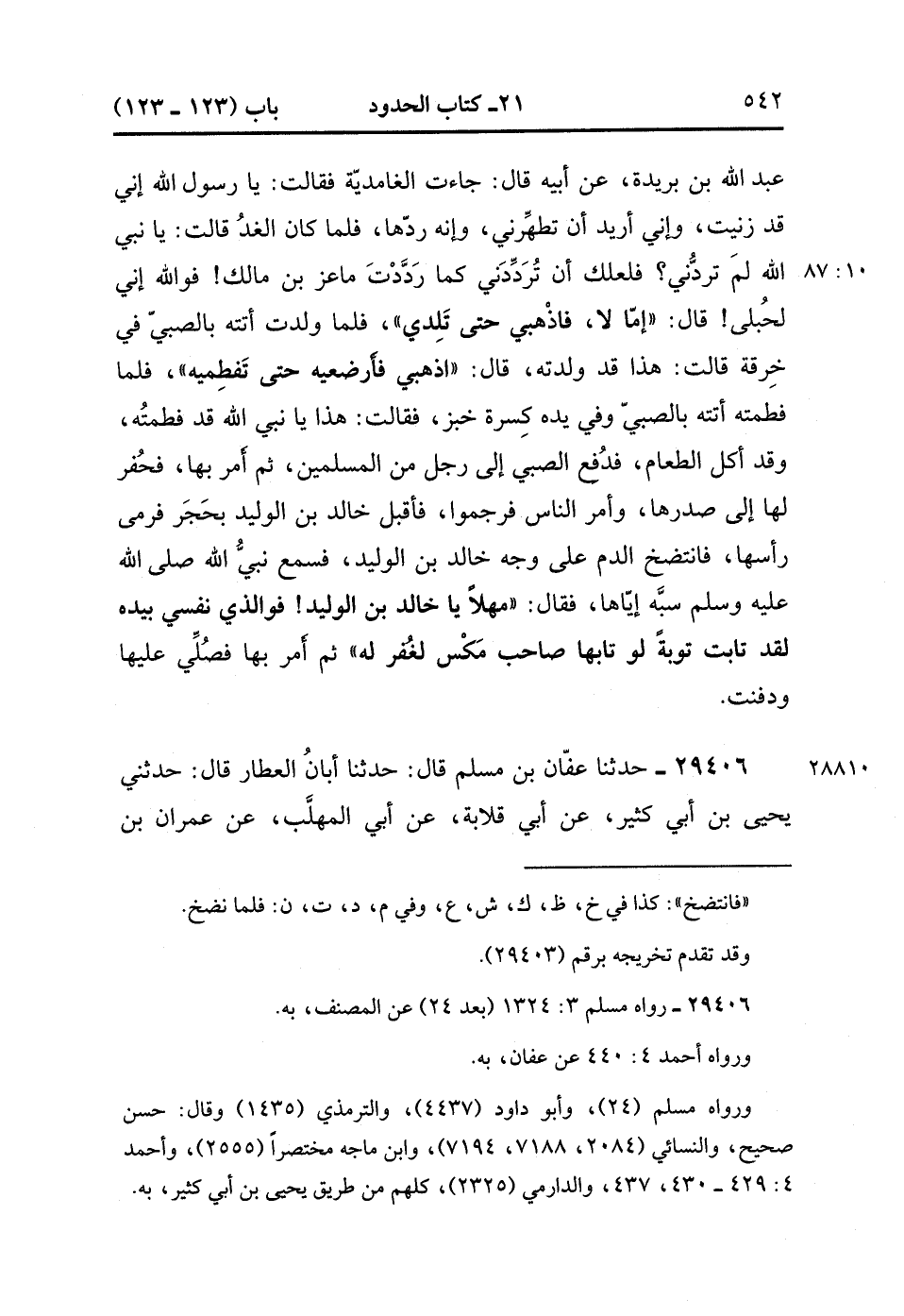 29406- حَدَّثَنَا عَفَّانُ بْنُ مُسْلِمٍ , قَالَ : حدَّثَنَا أَبَانُ الْعَطَّارُ ، قَالَ : حَدَّثَنَي يَحْيَى بْنُ أَبِي كَثِيرٍ ، عَنْ أَبِي قِلاَبَةَ ، عَنْ أَبِي الْمُهَلَّبِ ، عَنْ عِمْرَانَ بْنِ حُصَيْنٍ ؛ أَنَّ امْرَأَةً مِنْ جُهَيْنَةَ أَتَتِ النَّبِيَّ صَلَّى الله عَلَيْهِ وَسَلَّمَ ، فَقَالَتْ : إِنِّي أَصَبْتُ حَدًّا فَأَقِمْهُ عَلَيَّ ، وَهِيَ حَامِلٌ ، فَأَمَرَ بِهَا أَنْ يُحْسَنَ إِلَيْهَا حَتَّى تَضَعَ ، فَلَمَّا أَنْ وَضَعَتْ ، جِيءَ بِهَا إِلَى رَسُولِ اللهِ صَلَّى الله عَلَيْهِ وَسَلَّمَ فَأَمَرَ بِهَا ، فَشُكَّتْ عَلَيْهَا ثِيَابُهَا ، ثُمَّ رَجَمَهَا وَصَلَّى عَلَيْهَا ، فَقَالَ عُمَرُ : يَا نَبِيَّ اللهِ ، أَتُصَلِّي عَلَيْهَا وَقَدْ زَنَتْ ؟ فَقَالَ : لَقَدْ تَابَتْ تَوْبَةً لَوْ قُسِمَتْ بَيْنَ سَبْعِينَ مِنْ أَهْلِ الْمَدِينَةِ لَوَسِعَتْهُمْ ، وَهَلْ وَجَدْتَ أَفْضَلَ مِنْ أَنْ جَادَتْ بِنَفْسِهَا. (10/87).