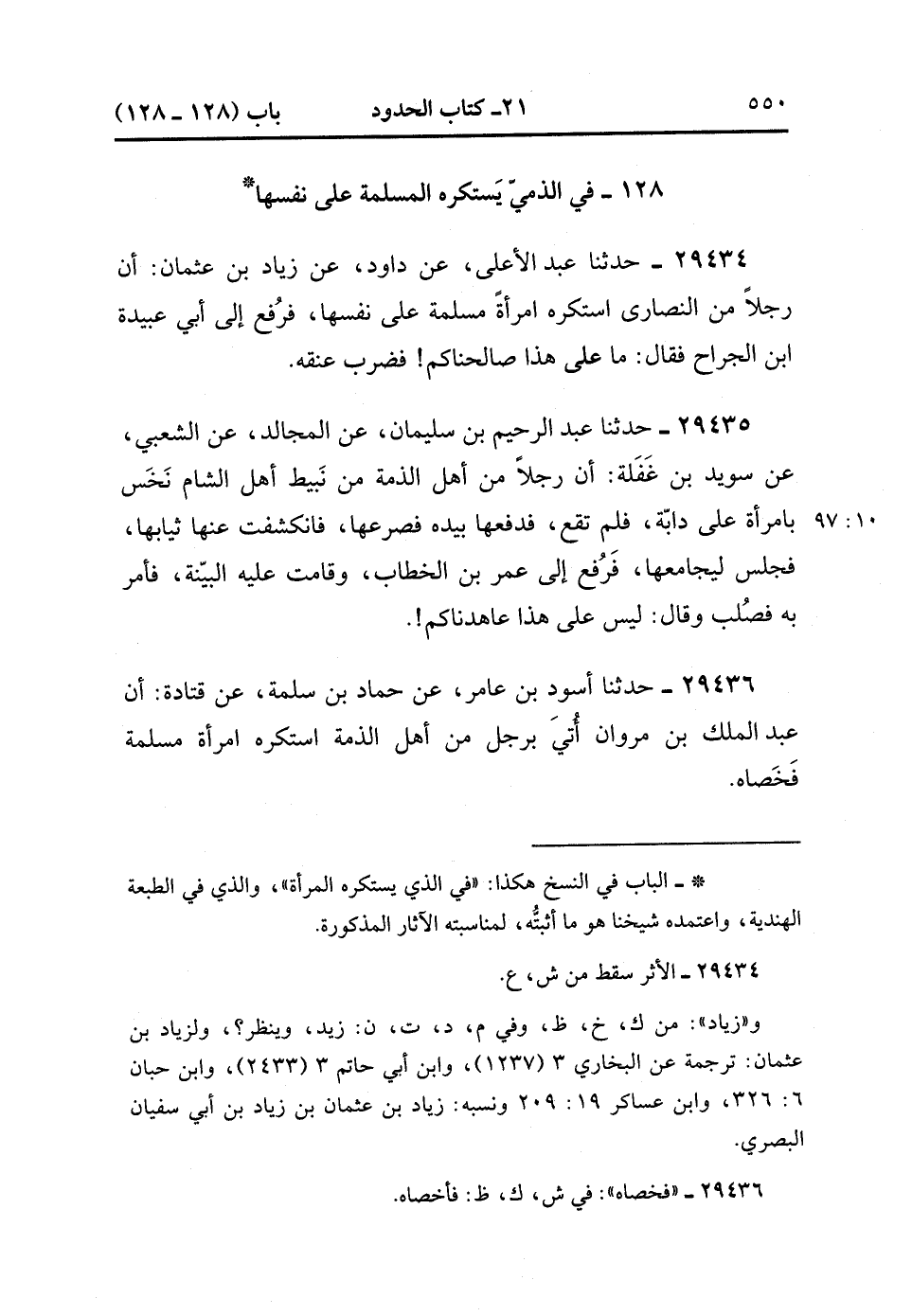 29434- حَدَّثَنَا عَبْدُ الأَعْلَى ، عَنْ دَاوُد ، عَنْ زِيَادِ بْنِ عُثْمَان ؛ أَنَّ رَجُلاً مِن النَّصَارَى اسْتَكْرَه امْرَأَةً مُسْلِمَةً عَلَى نَفْسِهَا ، فَرُفِعَ إِلَى أَبِي عُبَيْدَةَ بْنِ الْجَرَّاحِ ، فَقَالَ : مَا عَلَى هَذَا صَالَحْنَاكُم ، فَضَرَبَ عُنُقَهُ.