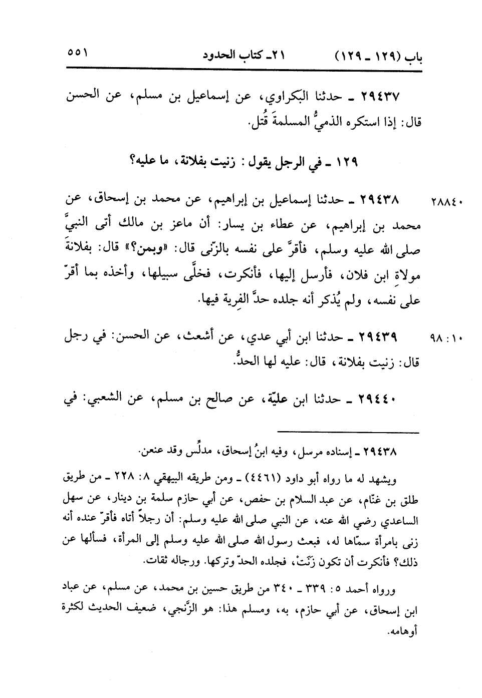 29438- حَدَّثَنَا إِسْمَاعِيلُ بْنُ إِبْرَاهِيمَ ، عَنْ مُحَمَّدِ بْنِ إِسْحَاقَ ، عَنْ مُحَمَّدِ بْنِ إِبْرَاهِيمَ ، عَنْ عَطَاءِ بْنِ يَسَارٍ ؛ أَنَّ مَاعِزَ بْنَ مَالِكٍ أَتَى النَّبِيَّ صَلَّى الله عَلَيْهِ وَسَلَّمَ ، فَأَقَرَّ عَلَى نَفْسِهِ بِالزِّنَا ، قَالَ : وَبِمَنْ ، قَالَ : بِفُلاَنَةَ مَوْلاَةِ ابْنِ فُلاَنٍ ، فَأَرْسَلَ إِلَيْهَا فَأَنْكَرَتْ ، فَخَلَّى سَبِيلَهَا ، وَأَخَذَهُ بِمَا أَقَرَّ عَلَى نَفْسِهِ ، وَلَمْ يُذْكَرْ أَنَّهُ جَلَدَهُ حَدَّ الْفِرْيَةِ فِيهَا. (10/97).