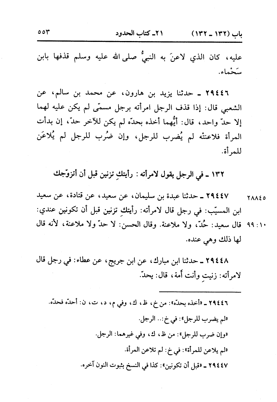 29447- حَدَّثَنَا عَبْدَةُ بْنُ سُلَيْمَانَ ، عَنْ سَعِيدٍ ، عَنْ قَتَادَةَ ، عَنْ سَعِيدِ بْنِ الْمُسَيَّبِ ؛ فِي رَجُلٍ قَالَ لاِمْرَأَتِهِ : رَأَيْتُكِ تَزْنِينَ قَبْلَ أَنْ تَكُونِين عَندِي ، قَالَ سَعِيدٌ : حَدٌّ ، وَلاَ مُلاَعَنَةَ. وَقَالَ الْحَسَنُ : لاَ حَدَّ ، وَلاَ مُلاَعَنةَ ، لأَنَّهُ قَالَ لَهَا ذَلِكَ وَهِيَ عَندَهُ. (10/98).