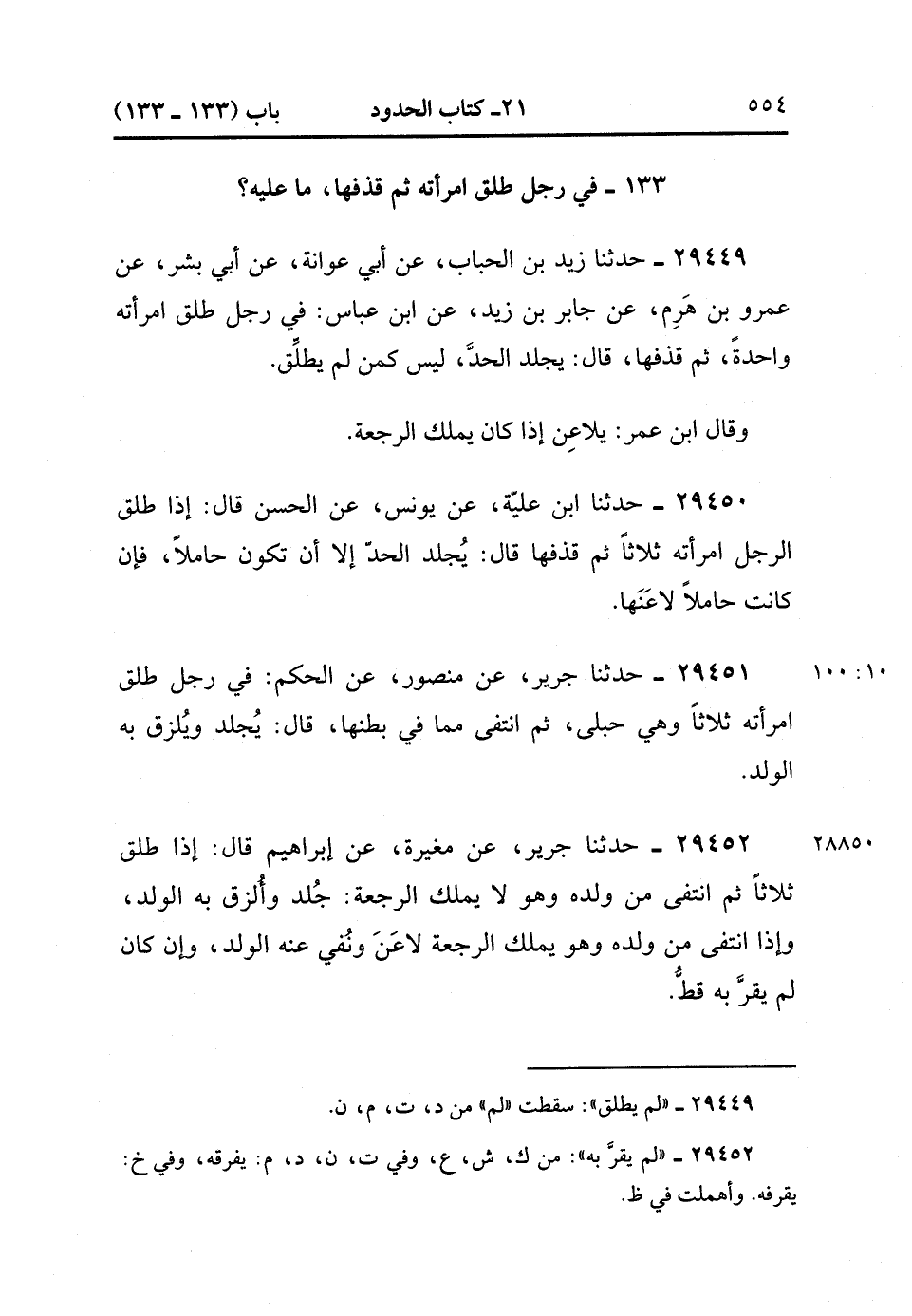 29452- حَدَّثَنَا جَرِيرٌ ، عَنْ مُغِيرَةَ ، عَنْ إِبْرَاهِيمَ ، قَالَ : إِذَا طَلَّقَ ثَلاَثًا ، ثُمَّ انْتَفَى مِنْ وَلَدِهِ وَهُوَ لاَ يَمْلِكُ الرَّجْعَةَ ، جُلِدَ ، وَأُلْزِقَ بِهِ الْوَلَدُ ، وَإِذَا انْتَفَى مِنْ وَلَدِهِ وَهُوَ يَمْلِكُ الرَّجْعَةَ لاَعَنَ ، وَنُفِيَ عَنْهُ الْوَلَدَ ، وَإِنْ كَانَ لَمْ يُقِرَّ بِهِ قَطُّ. (10/100).
