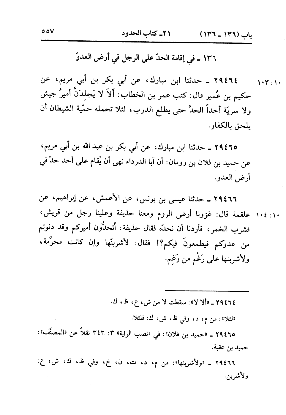 29464- حَدَّثَنَا ابْنُ مُبَارَكٍ ، عَنْ أَبِي بَكْرِ بْنِ أَبِي مَرْيَمَ ، عَنْ حَكِيمِ بْنِ عُمَيْرٍ ، قَالَ : كَتَبَ عُمَرُ بْنُ الْخَطَّابِ : أَلاَّ لاَ يَجْلِدَنَّ أَمِيرُ جَيْشٍ ، وَلاَ سَرِيَّةٍ أَحَدًا الْحَدَّ ، حَتَّى يَطْلُعَ الدَّرْبِ ، لِئَلاَ تَحْمِلَهُ حَمِيَّةُ الشَّيْطَانِ أَنْ يَلْحَقَ بِالْكُفَّارِ. (10/102).