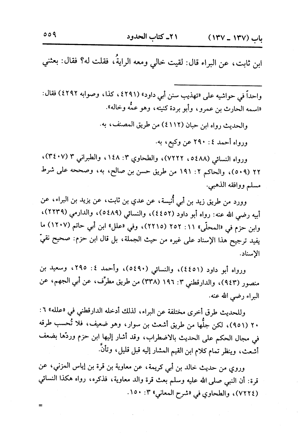 29470- حَدَّثَنَا وَكِيعٌ ، عَنْ حَسَنِ بْنِ صَالِحٍ ، عَنِ السَّدِيِّ ، عَنْ عَدِيِّ بْنِ ثَابِتٍ ، عَنِ الْبَرَاءِ ، قَالَ : لَقِيت خَالِي وَمَعَهُ الرَّايَةُ ، فَقُلْتُ لَهُ ؟ فَقَالَ : بَعَثَنِي النَّبِيُّ صَلَّى الله عَلَيْهِ وَسَلَّمَ إِلَى رَجُلٍ تَزَوَّجَ امْرَأَةَ أَبِيهِ أَنْ أَقْتُلَهُ ، أَوْ أَضْرِبَ عُنُقَهُ. (10/104).