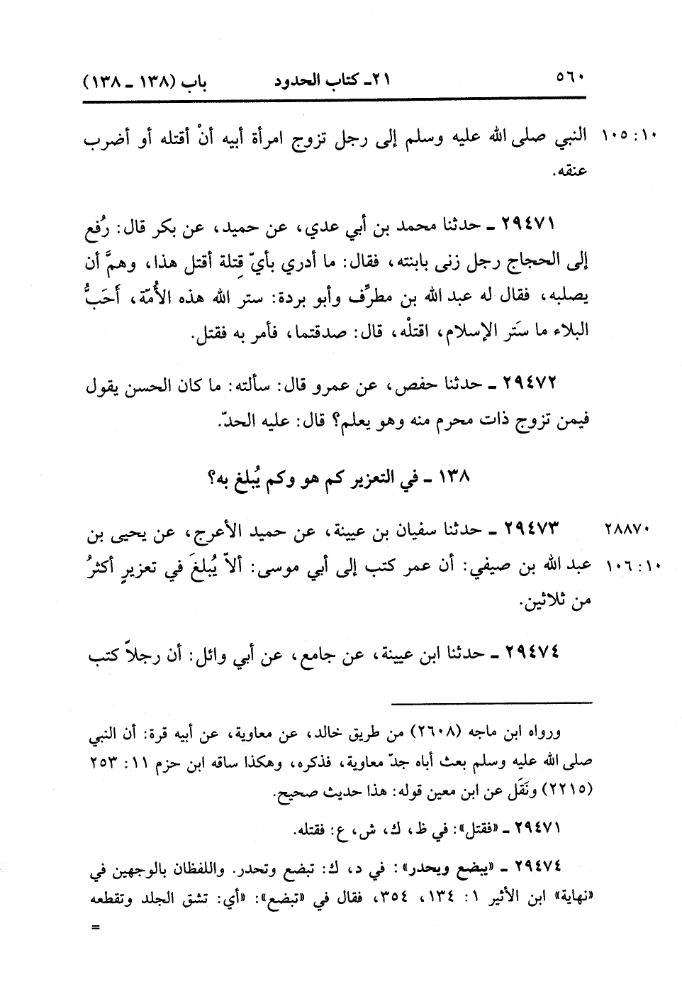29473- حَدَّثَنَا سُفْيَانُ بْنُ عُيَيْنَةَ ، عَنْ حُمَيْدٍ الأَعْرَجِ ، عَنْ يَحْيَى بْنِ عَبْدِ اللهِ بْنِ صَيْفِيٍّ ؛ أَنَّ عُمَرَ كَتَبَ إِلَى أَبِي مُوسَى : أَلاَ يُبْلَغُ فِي تَعْزِيرٍ أَكْثَرُ مِنْ ثَلاَثِينَ. (10/105).