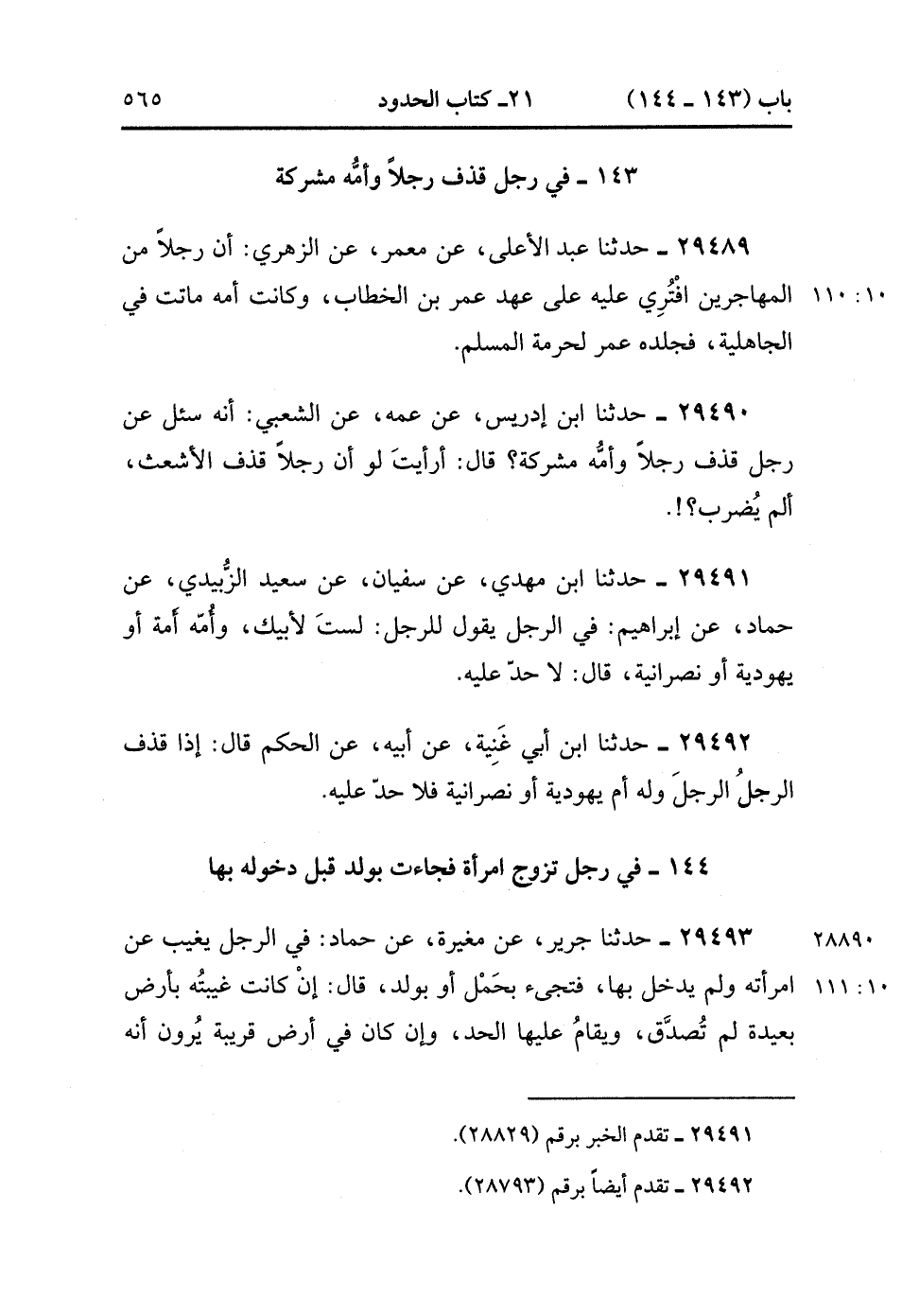 29491- حَدَّثَنَا ابْنُ مَهْدِيٍّ ، عَنْ سُفْيَانَ ، عَنْ سَعِيدٍ الزُّبَيْدِيِّ ، عَنْ حَمَّادٍ ، عَنْ إِبْرَاهِيمَ ؛ فِي الرَّجُلِ يَقُولُ لِلرَّجُلِ : لَسْتَ لأَبِيك ، وَأُمُّهُ أَمَةٌ ، أَوْ يَهُودِيَّةٌ ، أَوْ نَصْرَانِيَّةٌ ، قَالَ : لاَ حَدَّ عَلَيْهِ.