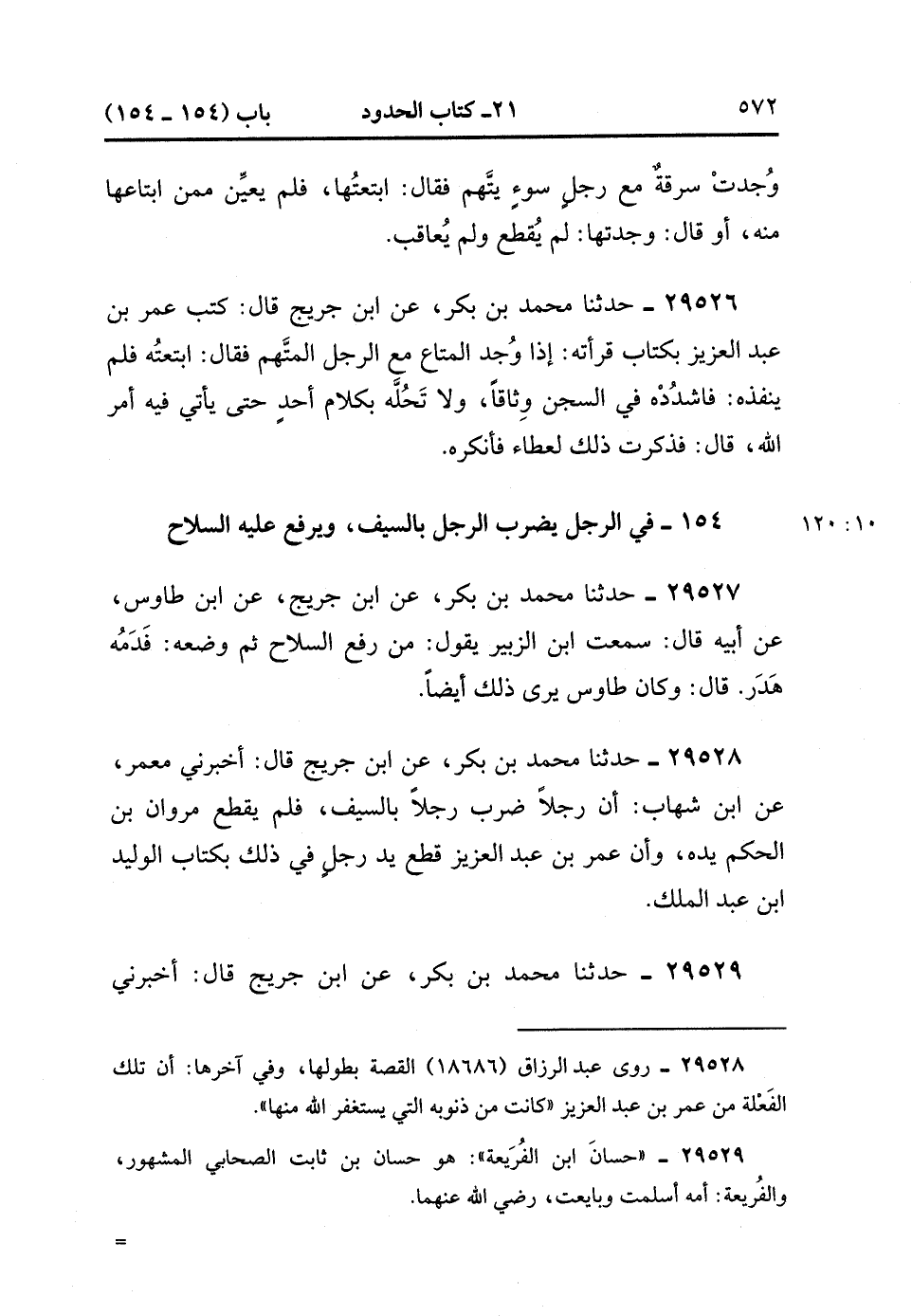 29528- حَدَّثَنَا مُحَمَّدُ بْنُ بَكْرٍ ، عَنِ ابْنِ جُرَيْجٍ ، قَالَ : أَخْبَرَنِي مَعْمَرٌ ، عَنِ ابْنِ شِهَابٍ ؛ أَنَّ رَجُلاً ضَرَبَ رَجُلاً بِالسَّيْفِ ، فَلَمْ يَقْطَعْ مَرْوَانُ بْنُ الْحَكَمِ يَدَهُ ، وَأَنَّ عُمَرَ بْنَ عَبْدِ الْعَزِيزِ قَطَعَ يَدَ رَجُلٍ فِي ذَلِكَ بِكِتَابِ الْوَلِيدِ بْنِ عَبْدِ الْمَلِكِ. (10/120).