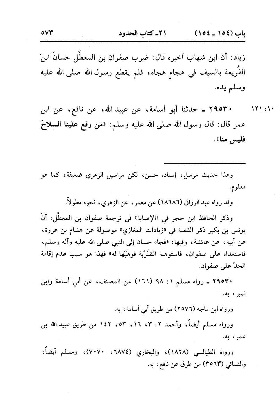 29529- حَدَّثَنَا مُحَمَّدُ بْنُ بَكْرٍ ، عَنِ ابْنِ جُرَيْجٍ ، قَالَ : أَخْبَرَنَي زِيَادٌ ؛ أَنَّ ابْنَ شِهَابٍ أَخْبَرَهُ ، قَالَ : ضَرَبَ صَفْوَانُ بْنُ الْمُعَطَّلِ حَسَّانَ بْنَ الْفُرَيْعَةِ بِالسَّيْفِ فِي هِجَاءٍ هَجَاهُ ، فَلَمْ يَقْطَعْ رَسُولُ اللهِ صَلَّى الله عَلَيْهِ وَسَلَّمَ يَدَهُ. (10/120).