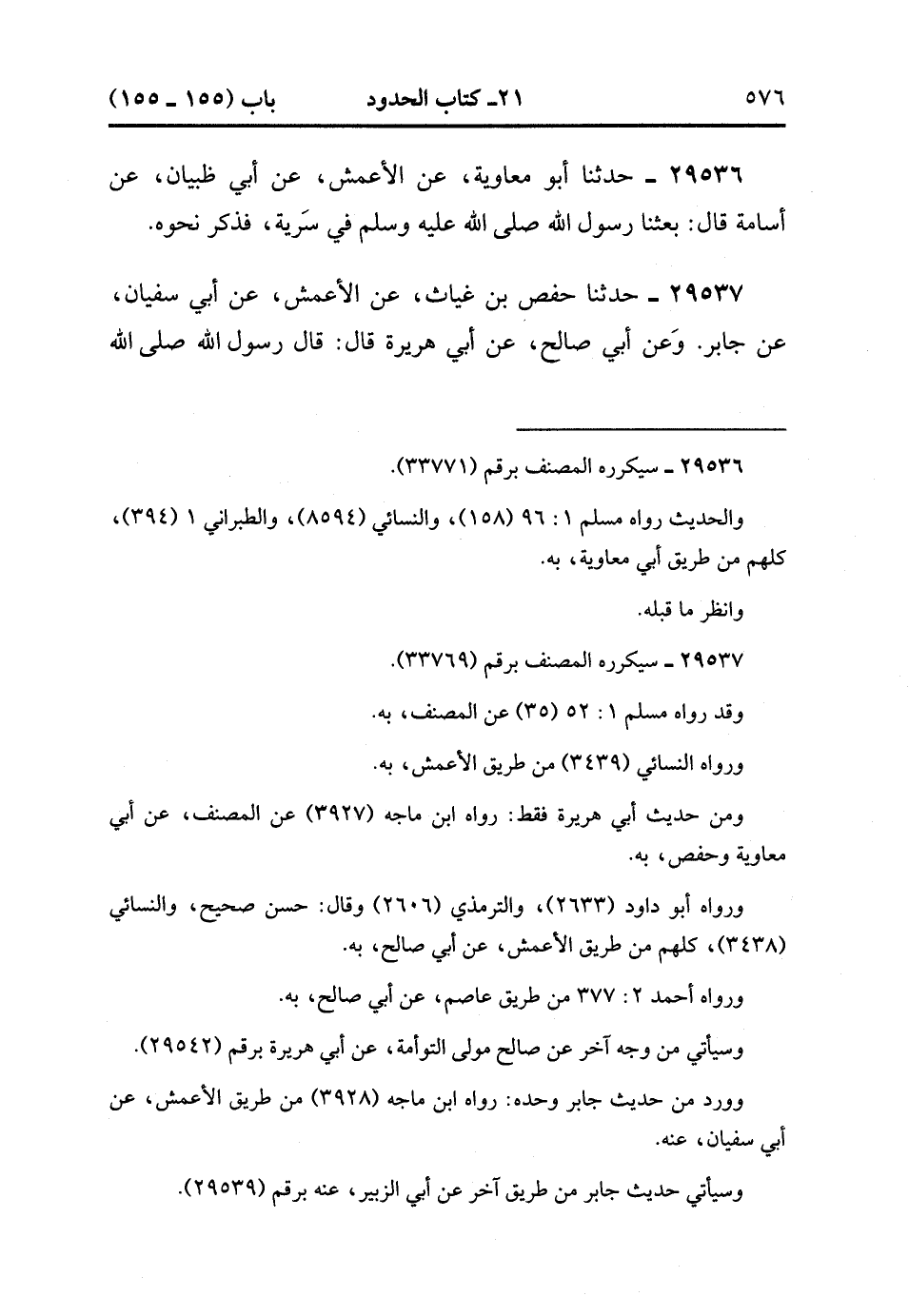 29537- حَدَّثَنَا حَفْصُ بْنُ غِيَاثٍ ، عَنِ الأَعْمَشِ ، عَنْ أَبِي سُفْيَانَ ، عَنْ جَابِرٍ (ح) وَعَنْ أَبِي صَالِحٍ ، عَنْ أَبِي هُرَيْرَةَ ، قَالا : قَالَ رَسُولُ اللهِ صَلَّى الله عَلَيْهِ وَسَلَّمَ : أُمِرْت أَنْ أُقَاتِلَ النَّاسَ حَتَّى يَقُولُوا : لاَ إِلَهَ إِلاَّ اللَّهُ ، فَإِذَا قَالُوهَا مَنَعُوا مِنِّي دِمَاءَهُمْ وَأَمْوَالَهُمْ إِلاَّ بِحَقِّهَا ، وَحِسَابُهُمْ عَلَى اللهِ. (10/122).