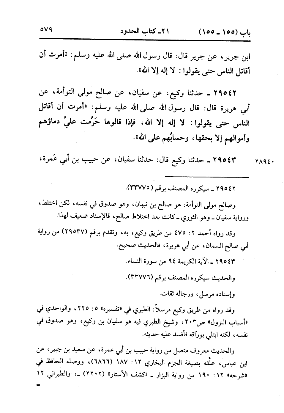 29542- حَدَّثَنَا وَكِيعٌ ، عَنْ سُفْيَانَ ، عَنْ صَالِحٍ مَوْلَى التَّوْأَمَةِ ، عَنْ أَبِي هُرَيْرَةَ ، قَالَ : قَالَ رَسُولُ اللهِ صَلَّى الله عَلَيْهِ وَسَلَّمَ : أُمِرْت أَنْ أُقَاتِلَ النَّاسَ حَتَّى يَقُولُوا لاَ إِلَهَ إِلاَّ اللَّهُ ، فَإِذَا قَالُوهَا حَرُمَتْ عَلَيَّ دِمَاؤُهُمْ وَأَمْوَالُهُمْ إِلاَّ بِحَقِّهَا ، وَحِسَابُهُمْ عَلَى اللهِ. (10/124).
