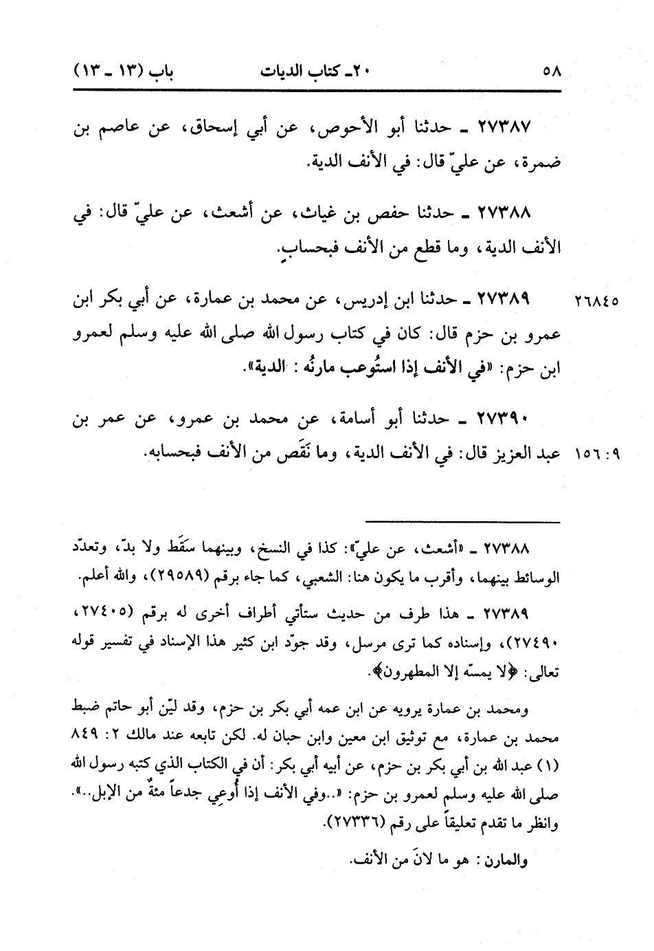 27390- حَدَّثَنَا أَبُو أُسَامَةَ ، عَنْ مُحَمَّدِ بْنِ عَمْرٍو ، عَنْ عُمَرَ بْنِ عَبْدِ الْعَزِيزِ ، قَالَ : فِي الأَنْفِ الدِّيَةُ ، وَمَا نَقَصَ مِنَ الأَنْفِ فَبِحِسَابِهِ. (9/155).