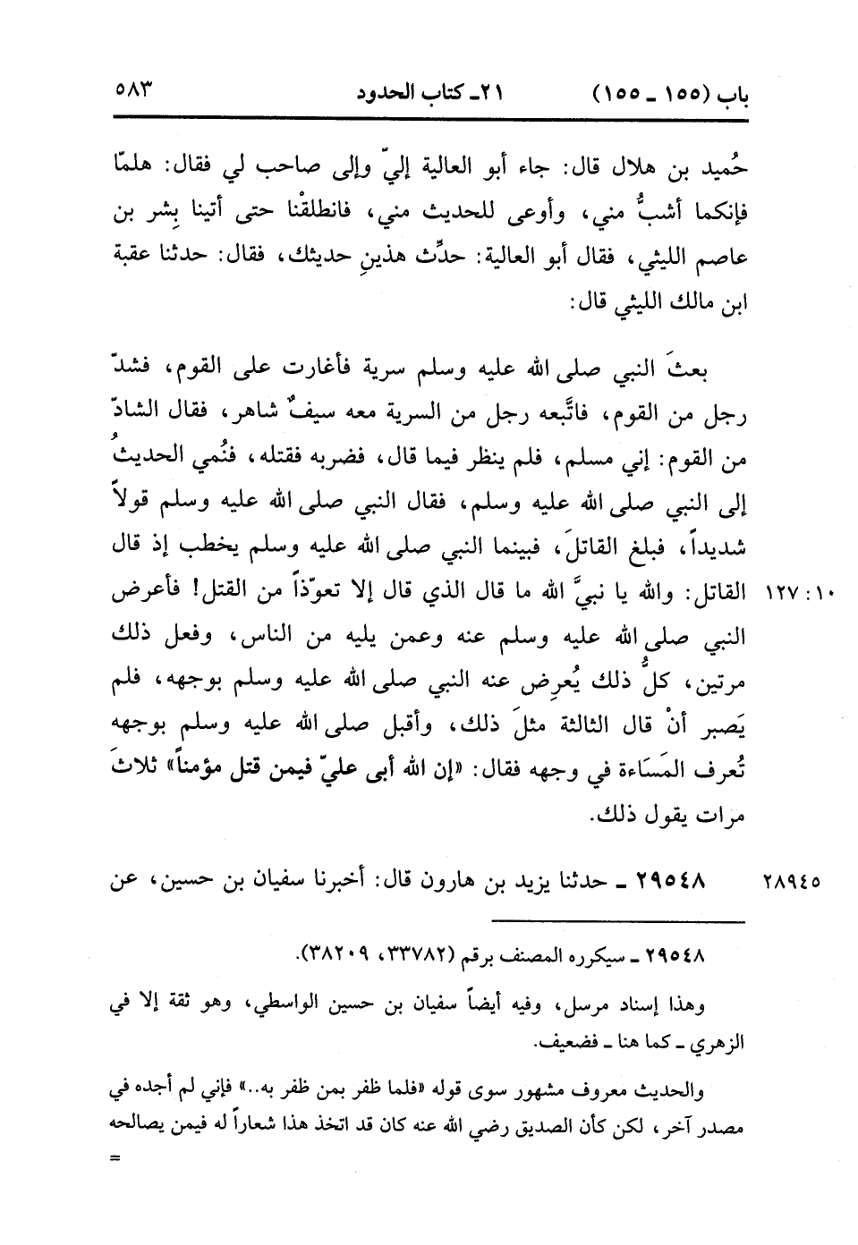 29547- حَدَّثَنَا شَبَابَةُ بْنُ سَوَّارٍ , قَالَ : حدَّثَنَا سُلَيْمَانُ بْنُ الْمُغِيرَةِ ، عنْ حُمَيْدِ بْنِ هِلاَلٍ ، قَالَ : جَاءَ أَبُو الْعَالِيَةِ إِلَيَّ وَإِلَى صَاحِبٍ لِي ، فَقَالَ : هَلُمَّا فَإِنَّكُمَا أَشَبُّ مِنِّي ، وأَوْعَى لِلْحَدِيثِ مِنِّي ، فَانْطَلَقْنَا حَتَّى أَتَيْنَا بِشْرَ بْنَ عَاصِمٍ اللَّيْثِيَّ ، فقال أَبُو الْعَالِيَةِ : حَدِّثْ هَذَيْنِ حَدِيثَكَ ، فَقَالَ : حَدَّثَنَا عٌُقْبَةُ بْنُ مَالِكِ اللَّيْثِيُّ ، قَالَ : بَعَثَ النَّبِيُّ صَلَّى الله عَلَيْهِ وَسَلَّمَ سَرِيَّةً ، فَأَغَارَتْ عَلَى الْقَوْمِ ، فَشَدَّ رَجُلٌ مِنَ الْقَوْمِ ، فَاتَّبَعَهُ رَجُلٌ مِنَ السَّرِيَّةِ مَعَهُ سَيْفٌ شَاهِرٌ ، فَقَالَ الشَّادُّ مِنَ الْقَوْمِ : إِنِّي مُسْلِمٌ ، فَلَمْ يَنْظُرْ فِيمَا قَالَ : فَضَرَبَهُ فَقَتَلَهُ ، فَنُمِّيَ الْحَدِيثُ إِلَى النَّبِيِّ صَلَّى الله عَلَيْهِ وَسَلَّمَ ، فَقَالَ النَّبِيُّ صَلَّى الله عَلَيْهِ وَسَلَّمَ قَوْلاً شَدِيدًا ، فَبَلَغَ الْقَاتِلَ ، فَبَيْنَمَا النَّبِيُّ صَلَّى الله عَلَيْهِ وَسَلَّمَ يَخْطُبُ ، إِذْ قَالَ الْقَاتِلُ : وَاللَّهِ يَا نَبِيَّ اللهِ ، مَا قَالَ الَّذِي قَالَ إِلاَّ تَعَوُّذًا مِنَ الْقَتْلِ ، فَأَعْرَضَ النَّبِيُّ صَلَّى الله عَلَيْهِ وَسَلَّمَ عَنْهُ ، وَعَمَّنْ يَلِيهِ مِنَ النَّاسِ ، وَفَعَلَ ذَلِكَ مَرَّتَيْنِ ، كُلُّ ذَلِكَ يُعْرِضُ عَنْهُ النَّبِيُّ صَلَّى الله عَلَيْهِ وَسَلَّمَ بِوَجْهِهِ ، فَلَمْ يَصْبِرْ أَنْ قَالَ الثَّالِثَةَ مِثْلَ ذَلِكَ ، وَأَقْبَلَ صَلَّى الله عَلَيْهِ وَسَلَّمَ بِوَجْهِهِ ، تُعْرَفُ الْمَسَاءَةُ فِي وَجْهِهِ ، فَقَالَ : إِنَّ اللَّهَ أَبَى عَلَيَّ فِيمَنْ قَتَلَ مُؤْمِنًا ، ثَلاَثَ مَرَّاتٍ يَقُولُ ذَلِكَ. (10/126).