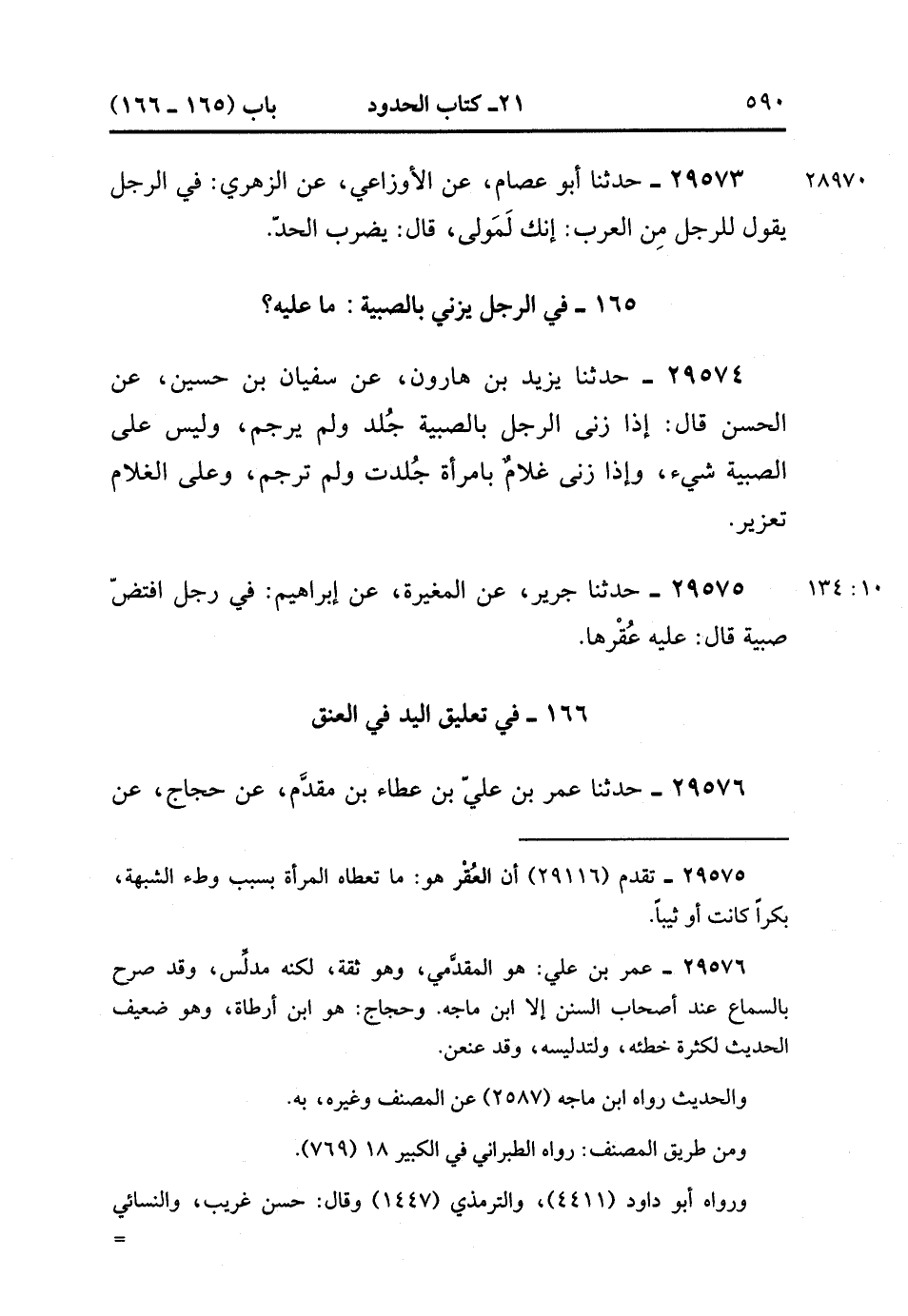 29574- حَدَّثَنَا يَزِيدُ بْنُ هَارُونَ ، عَنْ سُفْيَانَ بْنِ حُسَيْنٍ ، عَنِ الْحَسَنِ ، قَالَ : إِذَا زَنَى الرَّجُلُ بِالصَّبِيَّةِ جُلِدَ وَلَمْ يُرْجَمْ ، وَلَيْسَ عَلَى الصَّبِيَّةِ شَيْءٌ ، وَإِذَا زَنَى غُلاَمٌ بِامْرَأَةٍ جُلِدَتْ وَلَمْ تُرْجَمْ ، وَعَلَى الْغُلاَمِ تَعْزِيرٌ. (10/133).