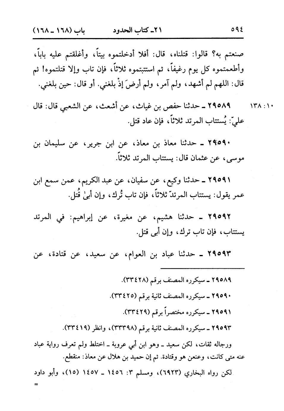 29592- حَدَّثَنَا هُشَيْمٍ ، عَنِ الْمُغِيرَةِ ، عَنْ إِبْرَاهِيمَ ؛ فِي الْمُرْتَدُّ يُسْتَتَابُ ، فَإِنْ تَابَ تُرِكَ ، وَإِنْ أَبِي قُتِلَ. (10/138).
