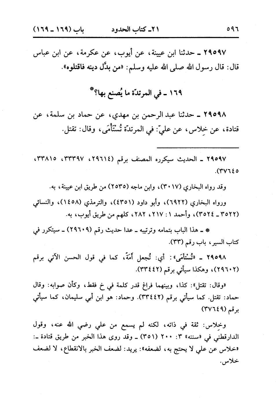 29597- حَدَّثَنَا ابْنُ عُيَيْنَةَ ، عَنْ أَيُّوبَ ، عَنْ عِكْرِمَةَ ، عَنِ ابْنِ عَبَّاسٍ ، قَالَ : قَالَ رَسُولُ اللهِ صَلَّى الله عَلَيْهِ وَسَلَّمَ : مَنْ بَدَّلَ دِينَهُ فَاقْتُلُوهُ.