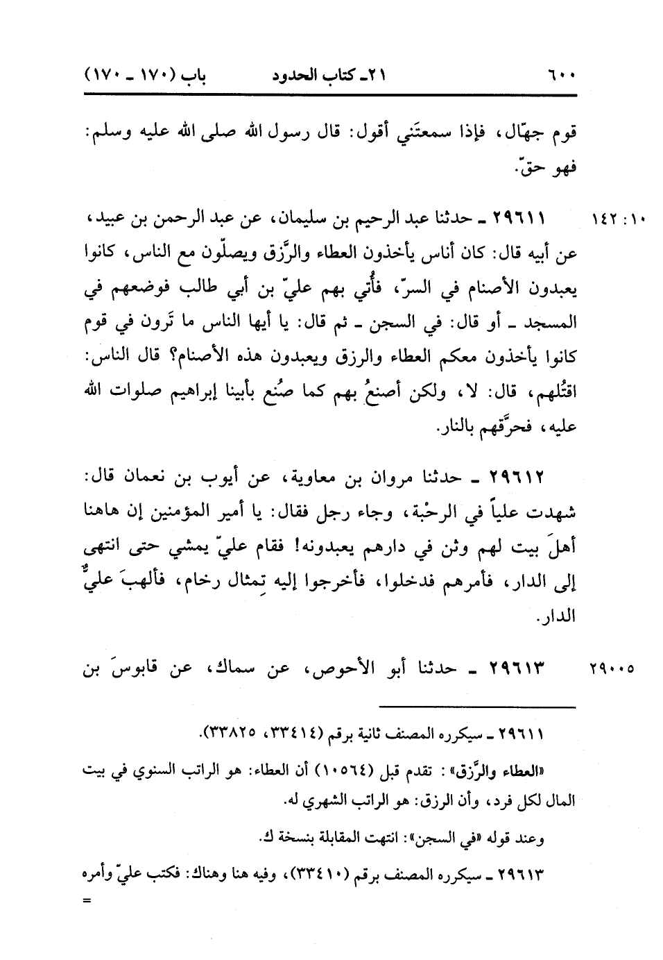 29611- حَدَّثَنَا عَبْدُ الرَّحِيمِ بْنُ سُلَيْمَانَ ، عَنْ عَبْدِ الرَّحْمَنِ بْنِ عُبَيْدٍ ، عَنْ أَبِيهِ ، قَالَ : كَانَ أُنَاسٌ يَأْخُذُونَ الْعَطَاءَ وَالرِّزْقَ وَيُصَلُّونَ مَعَ النَّاسِ كَانُوا يَعْبُدُونَ الأَصْنَامَ فِي السِّرِّ ، فَأُتِيَ بِهِمْ عَلِيُّ بْنُ أَبِي طَالِبٍ فَوَضَعَهُمْ فِي الْمَسْجِدِ ، أَوْ قَالَ : فِي السِّجْنِ ، ثُمَّ قَالَ : يَا أَيُّهَا النَّاسُ ، مَا تَرَوْنَ فِي قَوْمٍ كَانُوا يَأْخُذُونَ مَعَكُم الْعَطَاءَ وَالرِّزْقَ ، وَيَعْبُدُونَ هَذِهِ الأَصْنَامَ ؟ قَالَ النَّاسُ : اقْتُلْهُمْ ، قَالَ : لاَ ، وَلَكِنْ أَصْنَعُ بِهِمْ كَمَا صُنِعَ بِأَبِينَا إِبْرَاهِيمَ صلوات الله عليه ، فَحَرَّقَهُمْ بِالنَّارِ.
