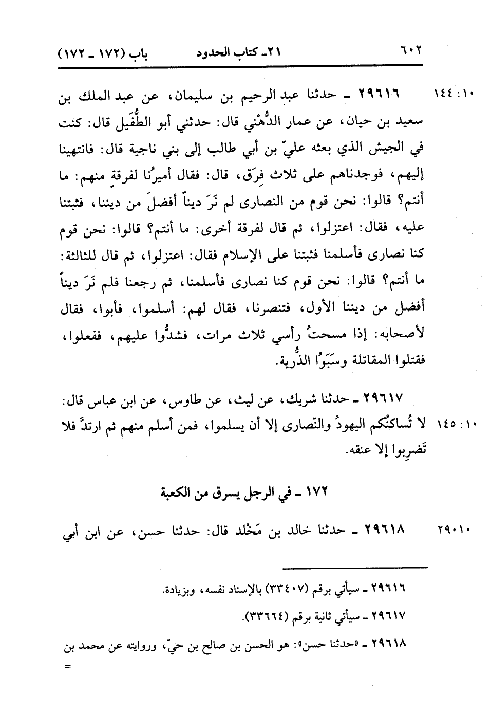 29616- حَدَّثَنَا عَبْدُ الرَّحِيمِ بْنُ سُلَيْمَانَ ، عَنْ عَبْدِ الْمَلِكِ بْنِ سَعِيدِ بْنِ حَيَّانَ ، عَنْ عَمَّارٍ الدَّهْنِيِّ ، قَالَ : حدَّثَنَي أَبُو الطُّفَيْلِ ، قَالَ : كُنْتُ فِي الْجَيْشِ الَّذِينَ بَعَثَهُ عَلِيُّ بْنُ أَبِي طَالِبٍ إِلَى بَنِي نَاجِيَةَ ، قَالَ : فَانْتَهَيْنَا إِلَيْهِمْ ، فَوَجَدْنَاهُمْ عَلَى ثَلاَثِ فِرَقٍ ، قَالَ : فَقَالَ أَمِيرُنَا لِفِرْقَةٍ مِنْهُمْ : مَا أَنْتُمْ ؟ قَالُوا : نَحْنُ قَوْمٌ مِنَ النَّصَارَى لَمْ نَرَ دِينًا أَفْضَلَ مِنْ دِينِنَا ، فَثَبَتْنَا عَلَيْهِ ، فَقَالَ : اعْتَزَلُوا ، ثُمَّ قَالَ لِفِرْقَةٍ أُخْرَى : مَا أَنْتُمْ ؟ قَالُوا : نَحْنُ قَوْمٌ كُنَّا نَصَارَى فَأَسْلَمْنَا فَثَبَتْنَا عَلَى الإِسْلاَمِ ، فَقَالَ : اعْتَزَلُوا ، ثُمَّ قَالَ لِلثَّالِثَةِ : مَا أَنْتُمْ ؟ قَالُوا : نَحْنُ قَوْمٌ كُنَّا نَصَارَى فَأَسْلَمْنَا ، ثُمَّ رَجَعْنَا ، فَلَمْ نَرَ دِينًا أَفْضَلَ مِنْ دِينِنَا الأَوَّلِ ، فَتَنَصَّرْنَا ، فَقَالَ لَهُمْ : أَسْلِمُوا ، فَأَبَوْا ، فَقَالَ لأَصْحَابِهِ : إِذَا مَسَحْتُ رَأْسِي ثَلاَثَ مَرَّاتٍ ، فَشُدُّوا عَلَيْهِمْ ، فَفَعَلُوا ، فَقَتَلُوا الْمُقَاتِلَةَ ، وَسَبَوْا الذَّرِيةَ.