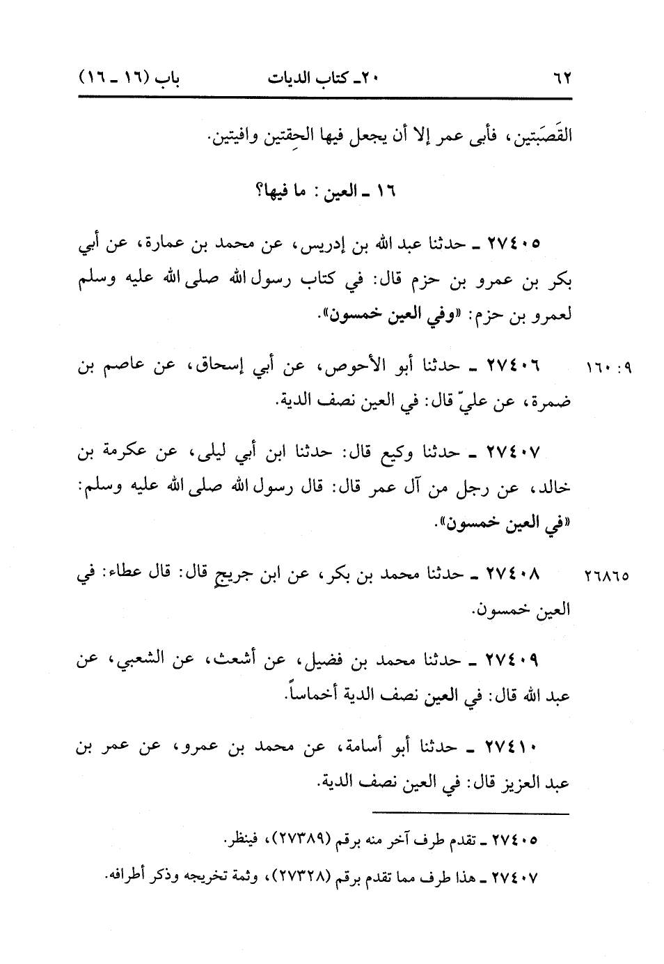 27405- حَدَّثَنَا عَبْدُ اللهِ بْنُ إِدْرِيسَ ، عَنْ مُحَمَّدِ بْنِ عُمَارَةَ ، عَنْ أَبِي بَكْرِ بْنِ عَمْرِو بْنِ حَزْمٍ ، قَالَ : فِي كِتَابِ رَسُولِ اللهِ صَلَّى الله عَلَيْهِ وَسَلَّمَ لِعَمْرِو بْنِ حَزْمٍ : وَفِي الْعَيْنِ خَمْسُونَ. (9/159).