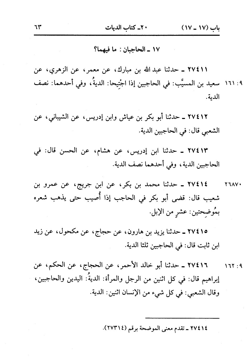 27411- حَدَّثَنَا عَبْدُ اللهِ بْنُ مُبَارَكٍ ، عَنْ مَعْمَرٍ ، عَنِ الزُّهْرِيِّ ، عَنْ سَعِيدِ بْنِ الْمُسَيَّبِ ؛ فِي الْحَاجِبَيْنِ إِذَا اجْتِيحَا الدِّيَةُ ، وَفِي أَحَدِهِمَا نِصْفُ الدِّيَةِ. (9/160).