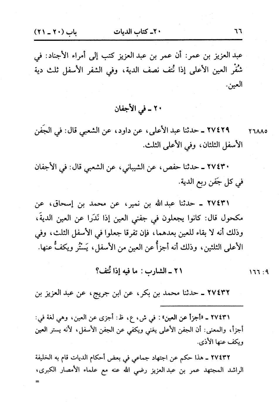 27431- حَدَّثَنَا عَبْدُ اللهِ بْنُ نُمَيْرٍ ، عَنْ مُحَمَّدِ بْنِ إِسْحَاقَ ، عَنْ مَكْحُولٍ ، قَالَ : كَانُوا يَجْعَلُونَ فِي جَفْنَيَ الْعَيْنِ إِذَا نَدَرَا عَنِ الْعَيْنِ الدِّيَةُ ، وَذَلِكَ أَنَّهُ لاَ بَقَاءَ لِلْعَيْنِ بَعْدَهُمَا ، فَإِنْ تَفَرَّقَا جَعَلُوا فِي الأَسْفَلِ الثُّلُثُ ، وَفِي الأَعْلَى الثُّلُثَيْنِ ، وَذَلِكَ أَنَّهُ أَجْزَأُ عَنِ الْعَيْنِ مِنَ الأَسْفَلِ ، يَسْترُ وَيَكُفُّ عَنْهَا. (9/165).