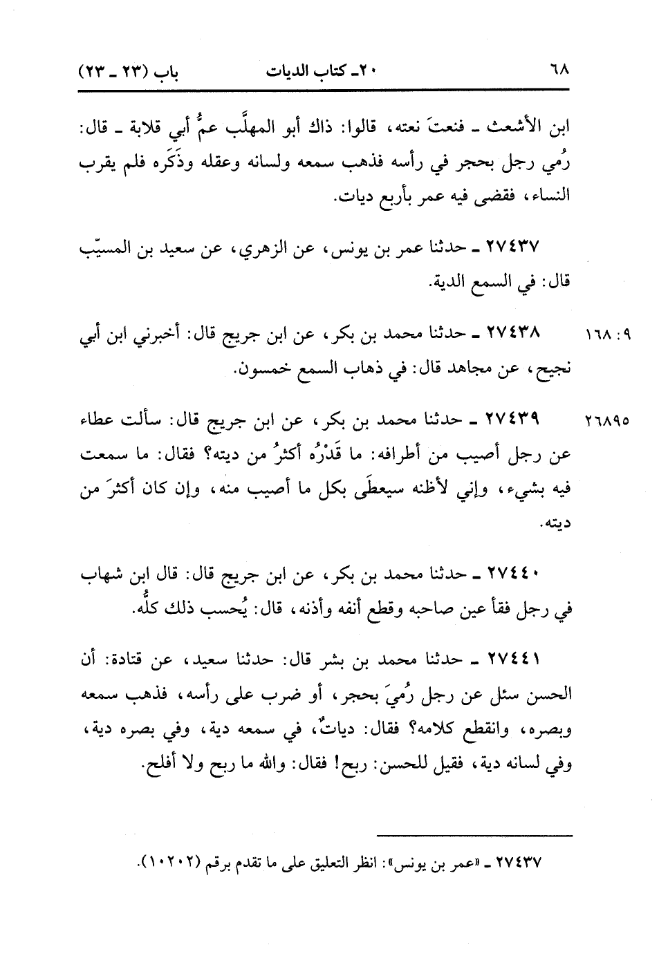 27441- حَدَّثَنَا مُحَمَّدُ بْنُ بِشْرٍ , قَالَ : حدَّثَنَا سَعِيدٌ ، عَنْ قَتَادَةَ ؛ أَنَّ الْحَسَنَ سُئِلَ عَنْ رَجُلٍ رُمِيَ بِحَجَرٍ ، أَوْ ضُرِبَ عَلَى رَأْسِهِ ، فَذَهَبَ سَمْعُهُ وَبَصَرُهُ ، وَانْقَطَعَ كَلأَمُهُ ؟ فَقَالَ : دِيَاتٌ ؛ فِي سَمْعِهِ دِيَةٌ ، وَفِي بَصَرِهِ دِيَةٌ ، وَفِي لِسَانِهِ دِيَةٌ ، فَقِيلَ لِلْحَسَنِ : رَبِحَ ، فَقَالَ : وَاللَّهِ مَا رَبِحَ ، وَلاَ أَفْلَحَ. (9/168).
