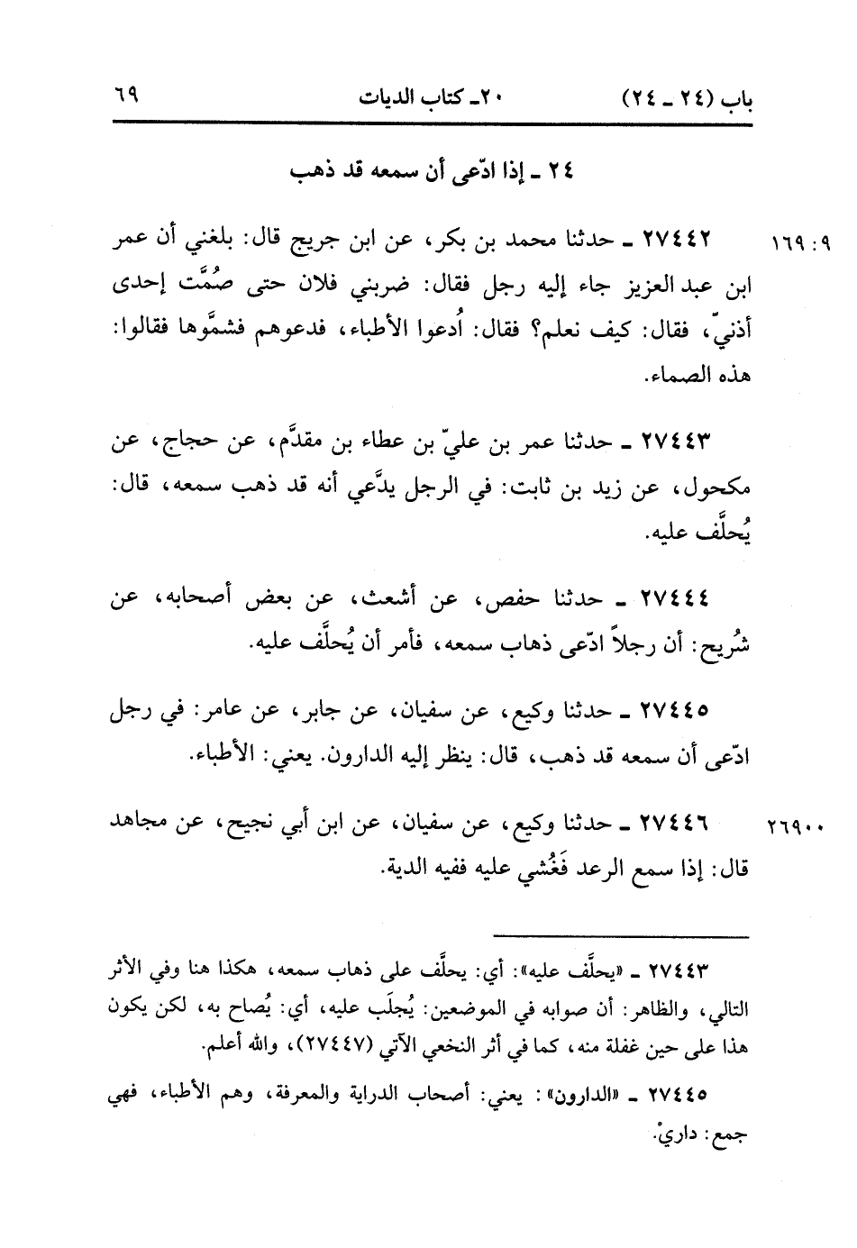 27442- حَدَّثَنَا مُحَمَّدُ بْنُ بَكْرٍ ، عَنِ ابْنِ جُرَيْجٍ ، قَالَ : بَلَغَنِي أَنَّ عُمَرَ بْنَ عَبْدِ الْعَزِيزِ جَاءَ إِلَيْهِ رَجُلٌ ، فَقَالَ : ضَرَبَنِي فُلاَنٌ حَتَّى صُمَّتْ إِحْدَى أُذُنَيْ ، فَقَالَ : كَيْفَ نَعْلَمُ ؟ فَقَالَ : ادْعُوَا الأَطِبَّاءَ ، فَدَعوهُمْ فَشَمُّوهَا ، فَقَالُوا : هَذِهِ الصَّمَّاءُ. (9/168).