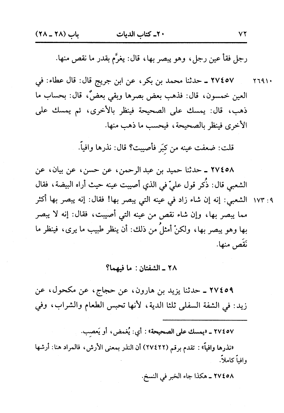 27458- حَدَّثَنَا حُمَيْدُ بْنُ عَبْدِ الرَّحْمَنِ ، عَنْ حَسَنٍ ، عَنْ بَيَانٍ ، عَنِ الشَّعْبِيِّ ، قَالَ : ذُكِرَ قَوْلُ عَلِيٍّ فِي الَّذِي أُصِيبَتْ عَيْنُهُ حَيْثُ أَرَاهُ الْبَيْضَةَ ، فَقَالَ الشَّعْبِيُّ : إِنَّهُ إِنْ شَاءَ زَادَ فِي عَيْنِهِ الَّتِي يُبْصِرُ بِهَا ، فَقَالَ : إِنَّهُ يُبْصِرُ بِهَا أَكْثَرَ مِمَّا يُبْصِرُ بِهَا ، وَإِنْ شَاءَ نَقَصَ مِنْ عَيْنِهِ الَّتِي أُصِيبَتْ ، فَقَالَ : إِنَّهُ لاَ يُبْصِرُ بِهَا وَهُوَ يُبْصِرُ بِهَا ، وَلَكِنَّ أَمْثَلَ مِنْ ذَلِكَ أَنْ يَنْظُرَ طَبِيبٌ مَا يَرَى ، فَيَنْظُرُ مَا نَقَصَ مِنْهَا. (9/172).