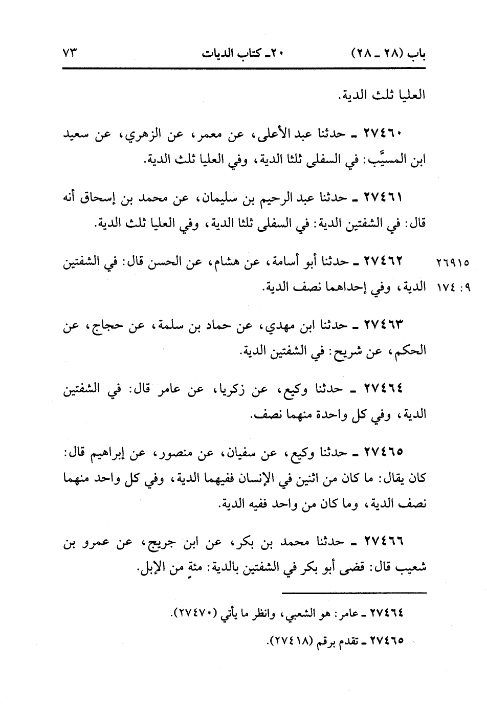 27462- حَدَّثَنَا أَبُو أُسَامَةَ ، عَنْ هِشَامٍ ، عَنِ الْحَسَنِ ، قَالَ : فِي الشَّفَتَيْنِ الدِّيَةُ ، وَفِي إِحْدَاهُمَا نِصْفُ الدِّيَةِ. (9/173).