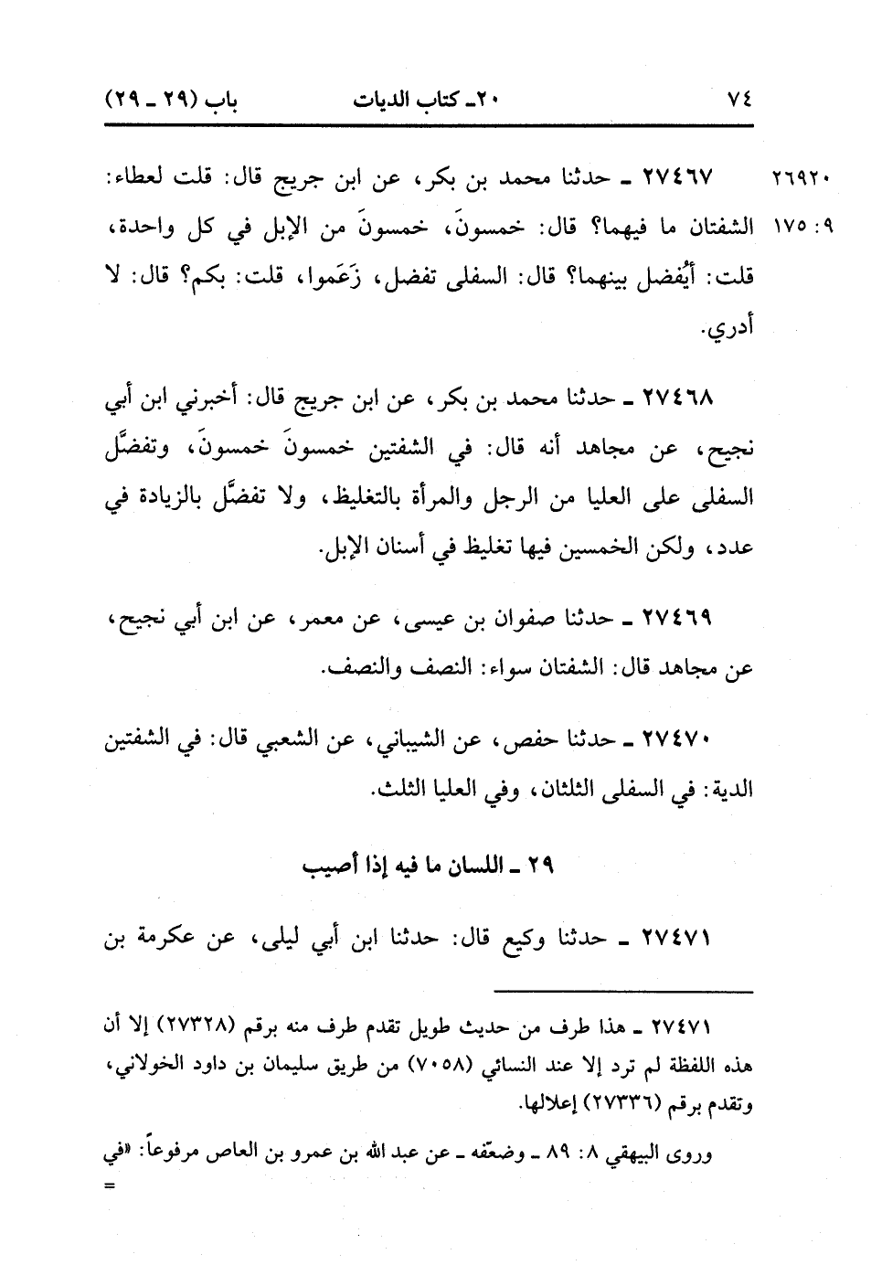 27470- حَدَّثَنَا حَفْصٌ ، عَنِ الشَّيْبَانِيِّ ، عَنِ الشَّعْبِيِّ ، قَالَ : فِي الشَّفَتَيْنِ الدِّيَةُ ، فِي السُّفْلَى الثُّلُثَانِ ، وَفِي الْعُلْيَا الثُّلُثُ. (9/175).