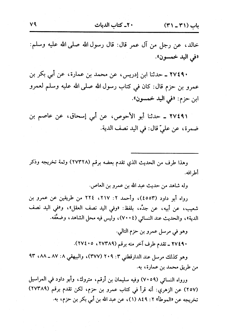 27491- حَدَّثَنَا أَبُو الأَحْوَصِ ، عَنْ أَبِي إِسْحَاقَ ، عَنْ عَاصِمِ بْنِ ضَمْرَةَ ، عَنْ عَلِيٍّ ، قَالَ : فِي الْيَدِ نِصْفُ الدِّيَةِ. (9/180).