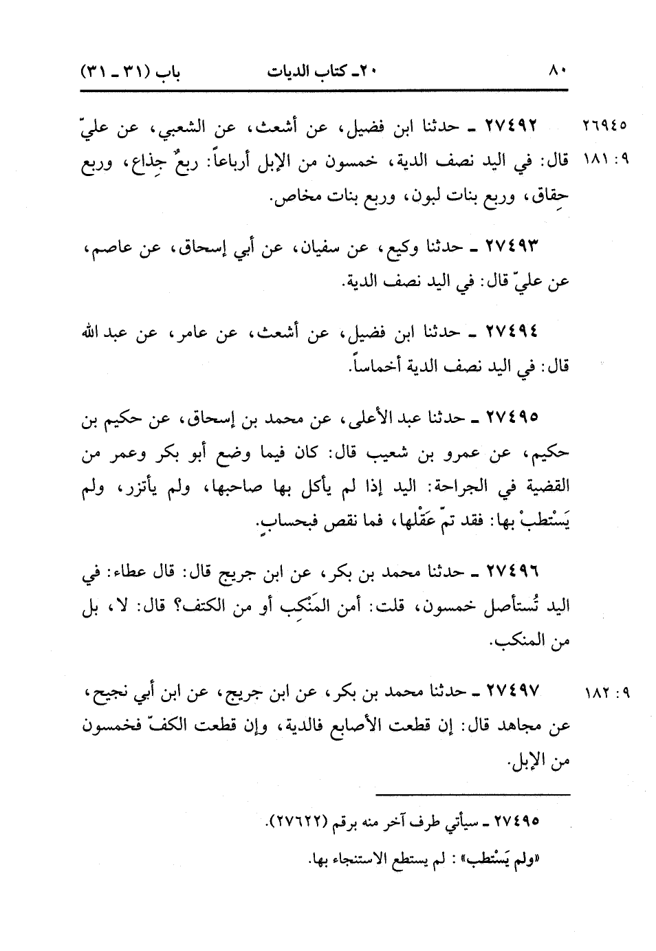27492- حَدَّثَنَا ابْنُ فُضَيْلٍ ، عَنْ أَشْعَثَ ، عَنِ الشَّعْبِيِّ ، عَنْ عَلِيٍّ ، قَالَ : فِي الْيَدِ نِصْفُ الدِّيَةِ ، خَمْسُونَ مِنَ الإِبِلِ أَرْبَاعًا ، رُبْعٌ جِذَاعٌ ، وَرُبْعٌ حِقَاقٌ ، وَرُبْعٌ بَنَاتُ لَبُونٍ ، وَرُبْعٌ بَنَاتُ مَخَاضٍ. (9/180).