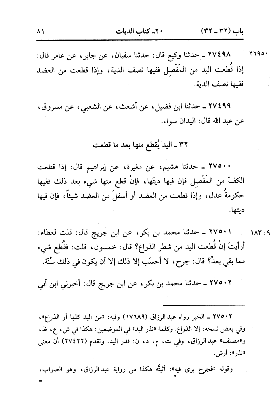 27500- حَدَّثَنَا هُشَيْمٌ ، عَنْ مُغِيرَةٍ ، عَنْ إِبْرَاهِيمَ ، قَالَ : إِذَا قُطِعَتِ الْكَفُّ مِنَ الْمِفْصَلِ ، فَإِنَّ فِيهَا دِيَتُهَا ، فَإِنْ قُطِعَ مِنْهُمَا شَيْءٌ بَعْدَ ذَلِكَ فَفِيهَا حُكُومَةُ عَدْلٍ ، وَإِذَا قُطِعَتْ مِنَ الْعَضُدِ ، أَوْ أَسْفَلَ مِنَ الْعَضُدِ شَيْئًا ، فَإِنَّ فِيهَا دِيَتُهَا. (9/182).