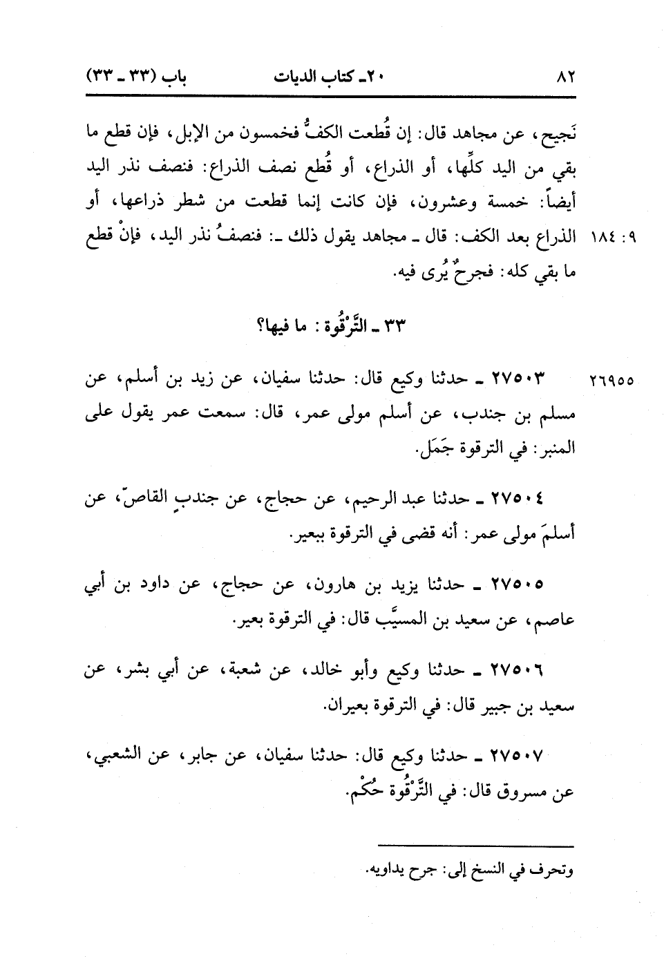 27507- حَدَّثَنَا وَكِيعٌ , قَالَ : حدَّثَنَا سُفْيَانُ ، عَنْ جَابِرٍ ، عَنِ الشَّعْبِيِّ ، عَنْ مَسْرُوقٍ ، قَالَ : فِي التَّرْقُوَةِ حُكْمٌ. (9/184).