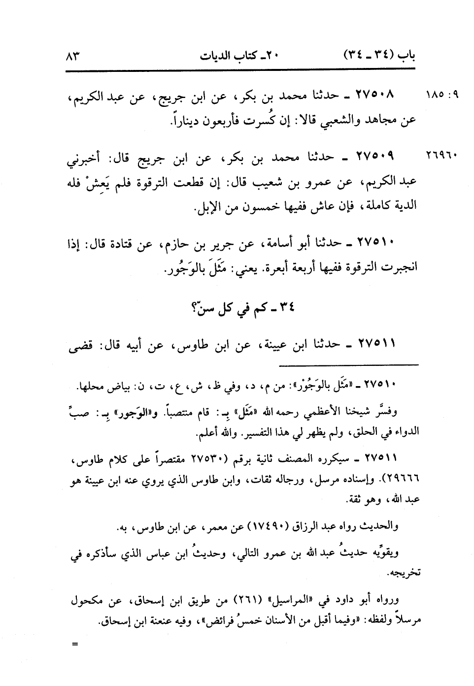 27510- حَدَّثَنَا أَبُو أُسَامَةَ ، عَنْ جَرِيرِ بْنِ حَازِمٍ ، عَنْ قَتَادَةَ ، قَالَ : إِذَا انْجَبَرَتِ التَّرْقُوَةُ فَفِيهَا أَرْبَعَةُ أَبْعِرَةٍ ، يَعْنِي مَثَلَ بِالوَجُور. (9/185).
