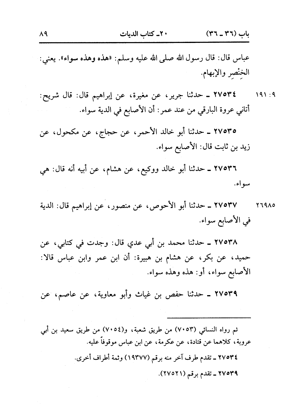 27538- حَدَّثَنَا مُحَمَّدُ بْنُ أَبِي عَدِيٍّ ، قَالَ : وَجَدْتُ فِي كِتَابِي عَنْ حُمَيْدٍ ، عَنْ بَكْرٍ ، عَنْ هِشَامِ بْنِ هُبَيْرَةٍ ؛ أَنَّ ابْنَ عُمَرَ ، وَابْنَ عَبَّاسٍ ، قَالاَ : الأَصَابِعُ سَوَاءٌ ، أَوْ هَذِهِ وَهَذِهِ سَوَاءٌ. (9/191).