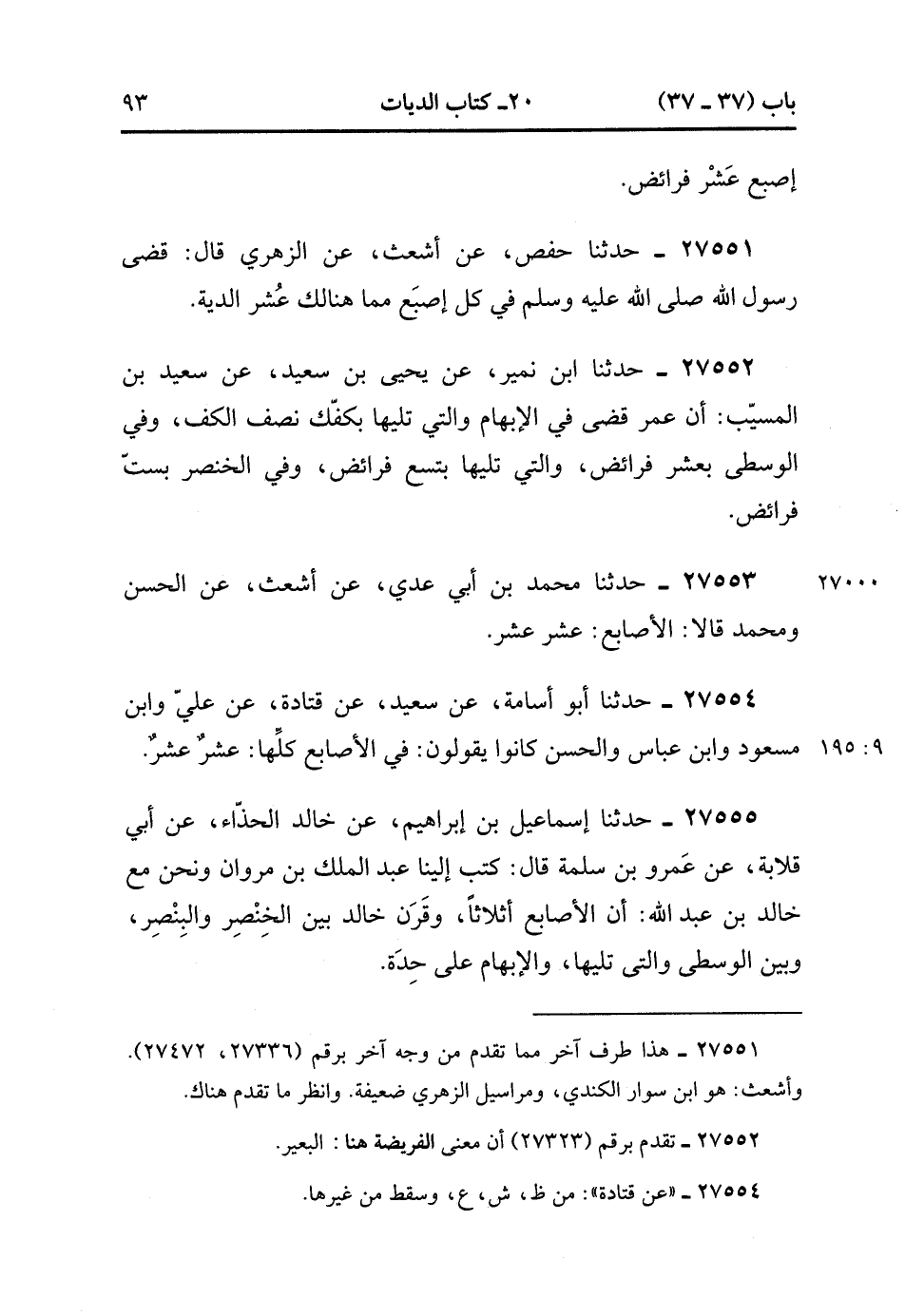 27554- حَدَّثَنَا أَبُو أُسَامَةَ ، عَنْ سَعِيدٍ ، عَنْ قَتَادَةَ ، عَنْ عَلِيٍّ ، وَابْنِ مَسْعُودٍ ، وَابْنِ عَبَّاسٍ ، وَالْحَسَنِ ، كَانُوا يَقُولُونَ : فِي الأَصَابِعِ كُلِّهَا عَشْرٌ عَشْرٌ. (9/194).