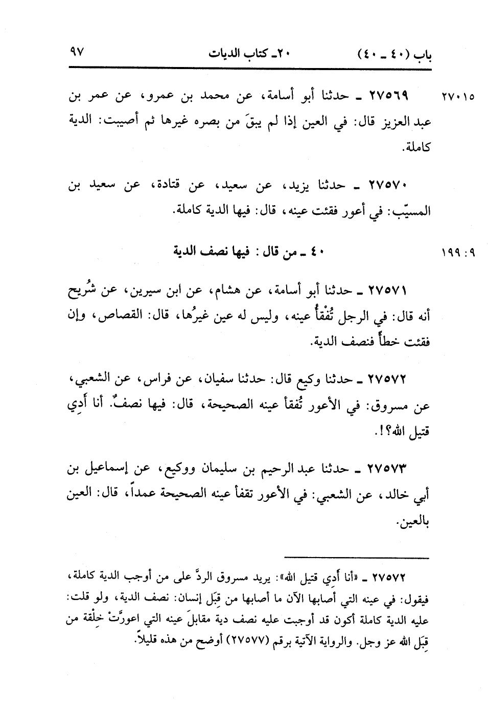 27573- حَدَّثَنَا عَبْدُ الرَّحِيمِ بْنُ سُلَيْمَانَ ، وَوَكِيعٌ ، عَنْ إِسْمَاعِيلَ بْنِ أَبِي خَالِدٍ ، عَنِ الشَّعْبِيِّ ؛ فِي الأَعْوَرِ تُفْقَأُ عَيْنُهُ الصَّحِيحَةُ عَمْدًا ، قَالَ : الْعَيْنُ بِالْعَيْنِ. (9/199).