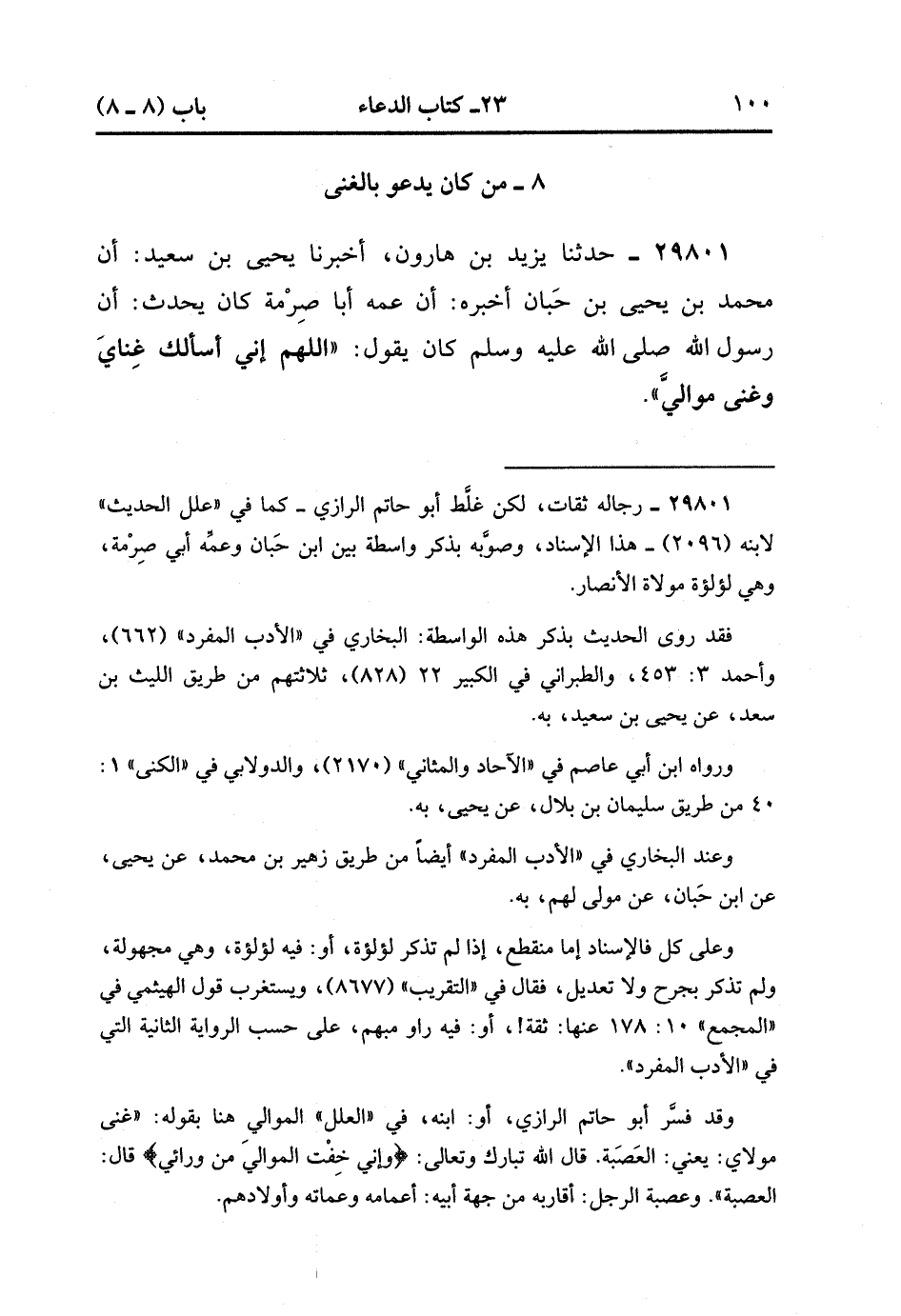29801- حَدَّثَنَا يَزِيدُ بْنُ هَارُونَ أَخْبَرَنَا يَحْيَى بْنُ سَعِيدٍ ، أَنَّ مُحَمَّدَ بْنَ يَحْيَى بْنِ حَبَّانَ أَخْبَرَهُ ، أَنَّ عَمَّهُ أَبَا صِرْمَةَ كَانَ يُحَدِّثُ ، أَنَّ رَسُولَ اللهِ صَلَّى الله عَلَيه وسَلَّم كَانَ يَقُولُ : اللَّهُمَّ إنِّي أَسْأَلُك غِنَايَ وَغِنَى مَوَالِيَ.