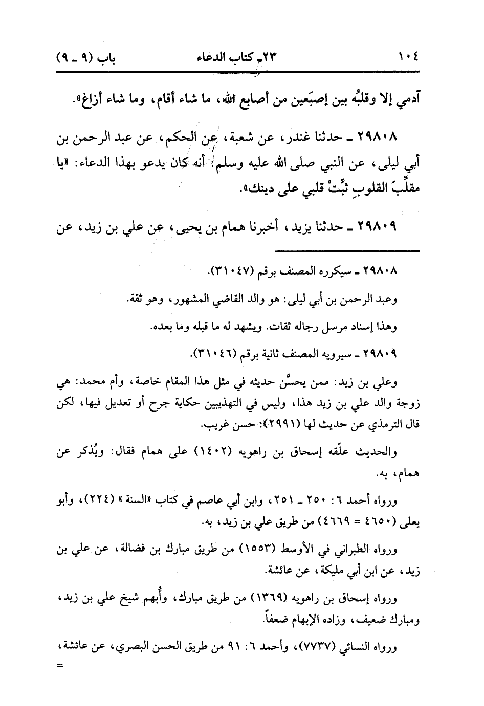 29809- حَدَّثَنَا يَزِيدُ , أَخْبَرَنَا هَمَّامُ بْنُ يَحْيَى ، عَنْ عَلِيِّ بْنِ زَيْدٍ ، عَنْ أُمِّ مُحَمَّدٍ ، عَنْ عَائِشَةَ قَالَتْ : كَانَ رَسُولُ اللهِ صَلَّى الله عَلَيْهِ وَسَلَّمَ يَقُولُ يَا مُقَلِّبَ الْقُلُوبِ ، ثَبِّتْ قَلْبِي عَلَى دِينِكَ ، قُلْتُ : يَا رَسُولَ اللهِ ، إنَّك تَدْعُو بِهَذَا الدُّعَاءِ ، قَالَ : يَا عَائِشَةُ ، أَو مَا عَلِمْتِ أَنَّ الْقُلُوبَ ، أَوْ قَالَ : قَلْبَ ابْنِ آدَمَ بَيْنَ إصْبَعَي اللهِ ، إذَا شَاءَ أَنْ يُقَلِّبَهُ إِلَى هُدَى قَلَبَهُ ، وَإِذَا شَاءَ أَنْ يُقَلِّبَهُ إِلَى ضَلالَةِ قَلَبَهُ . (10/210).