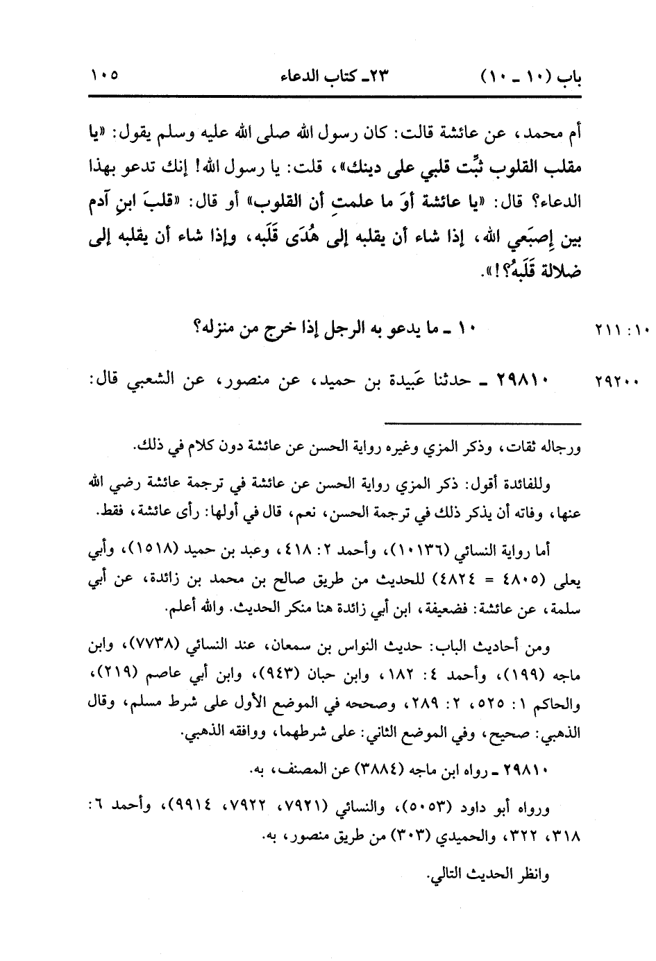 29810- حَدَّثَنَا عَبِيدَةُ بْنُ حُمَيْدٍ ، عَنْ مَنْصُورٍ ، عَنِ الشَّعْبِيِّ قَالَ : قالَتْ أُمُّ سَلَمَةَ : كَانَ النَّبِيُّ صَلَّى الله عَلَيْهِ وَسَلَّمَ إذَا خَرَجَ قَالَ : اللَّهُمَّ إنِّي أَعُوذُ بِكَ مِنْ أَنْ أَزِلَّ ، أَوْ أَضِلَّ ، أَوْ أَظْلِمَ ، أَوْ أُظْلَمَ ، أَوْ أَجْهَلَ ، أَوْ يُجْهَلَ عَلَيَّ. (10/211).