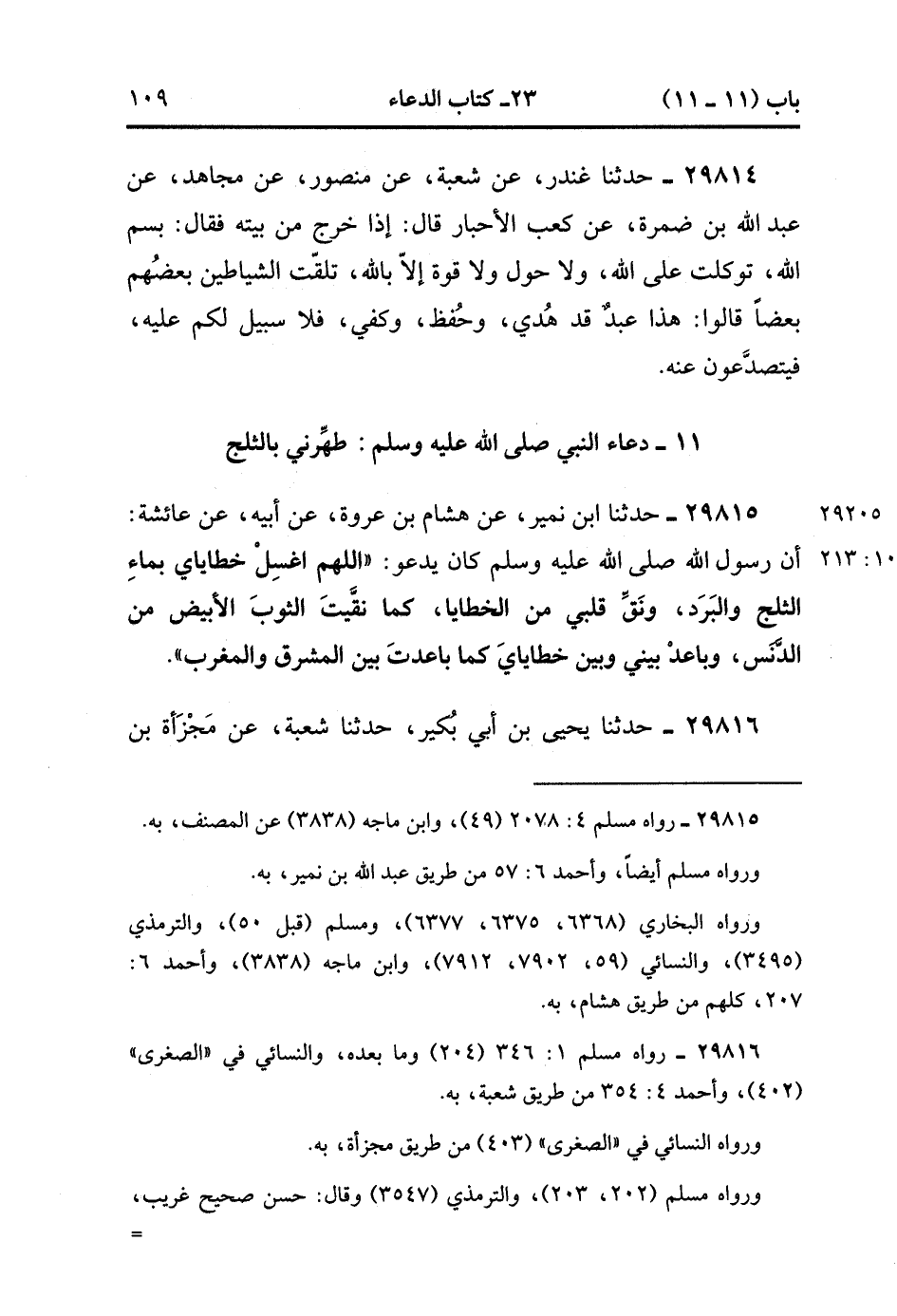 29815- حَدَّثَنَا ابْنُ نُمَيْرٍ ، عَنْ هِشَامِ بْنِ عُرْوَةَ ، عَنْ أَبِيهِ ، عَنْ عَائِشَةَ ، أَنَّ رَسُولَ اللهِ صَلَّى الله عَلَيْهِ وَسَلَّمَ كَانَ يَدْعُو : اللَّهُمَّ اغْسِلْ خَطَايَايَ بِمَاءِ الثَّلْجِ وَالْبَرَدِ وَنَقِّ قَلْبِي مِنَ الْخَطَايَا كَمَا نَقَّيْت الثَّوْبَ الأَبْيَضَ مِنَ الدَّنَسِ ، وَبَاعِدْ بَيْنِي وَبَيْنَ خَطَايَايَ كَمَا بَاعَدْت بَيْنَ الْمَشْرِقِ وَالْمَغْرِبِ. (10/212).