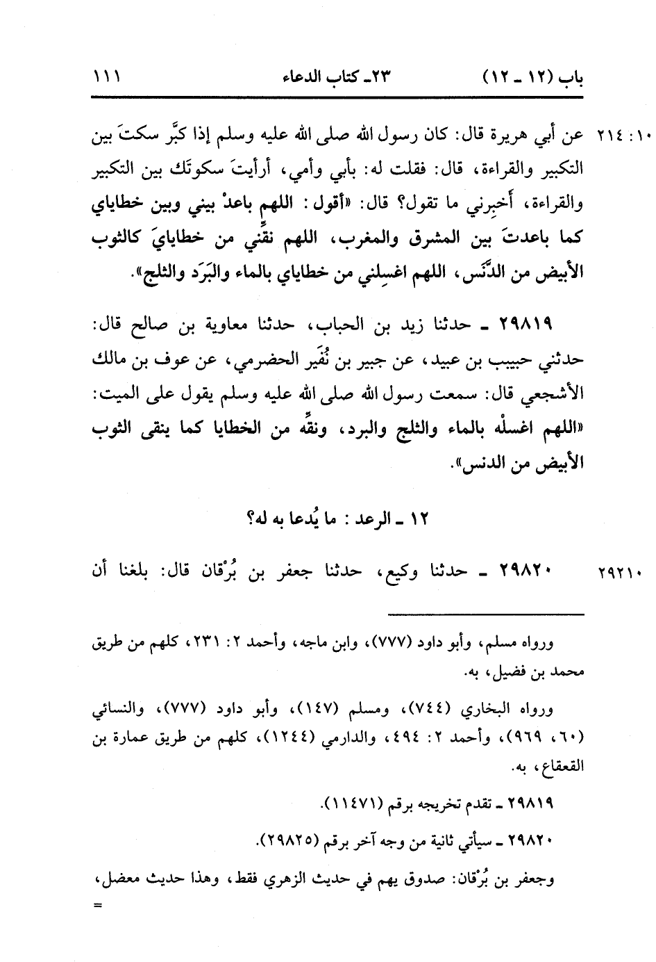 29819- حَدَّثَنَا زَيْدُ بْنُ الْحُبَابِ ، حَدَّثَنَا مُعَاوِيَةُ بْنُ صَالِحٍ قَالَ : حدَّثَنَي حَبِيبُ بْنُ عُبَيْدٍ ، عَنْ جُبَيْرِ بْنِ نُفَيْرٍ الْحَضْرَمِيِّ ، عَنْ عَوْفِ بْنِ مَالِكٍ الأَشْجَعِيِّ ، قَالَ : سَمِعْتُ رَسُولَ اللهِ صَلَّى الله عَلَيْهِ وَسَلَّمَ يَقُولُ عَلَى الْمَيِّتِ : اللَّهُمَّ اغْسِلْهُ بِالْمَاءِ وَالثَّلْجِ وَالْبَرَدِ وَنَقِّهِ مِنَ الْخَطَايَا كَمَا يُنَقَّى الثَّوْبُ الأَبْيَضُ مِنَ الدَّنَسِ.