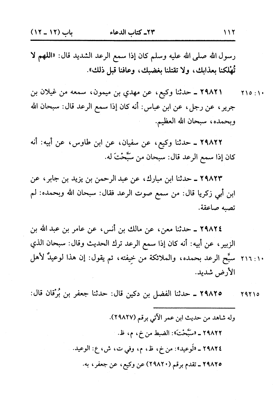 29824- حَدَّثَنَا مَعَن ، عَنْ مَالِكِ بْنِ أَنَسٍ ، عَنْ عَامِرِ بْنِ عَبْدِ اللهِ بْنِ الزُّبَيْرِ ، عَنْ أَبِيهِ ، أَنَّهُ كَانَ إذَا سَمِعَ الرَّعْدَ تَرَكَ الْحَدِيثَ ، وَقَالَ : سُبْحَانَ الَّذِي سَبَّحَ الرَّعْدُ بِحَمْدِهِ وَالْمَلائِكَةُ مِنْ خِيفَتِهِ ، ثُمَّ يَقُولُ : إنَّ هَذَا لَوَعِيدٌ لأَهْلِ الأَرْضِ شَدِيدٌ. (10/215).